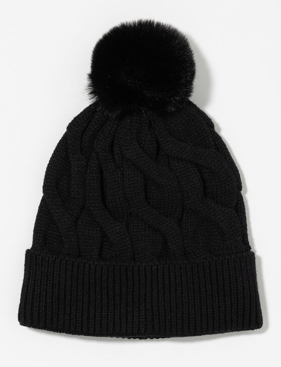 Affrontez le froid avec style grâce à cette tuque torsadée ornée d’un doux pompon en fausse fourrure.