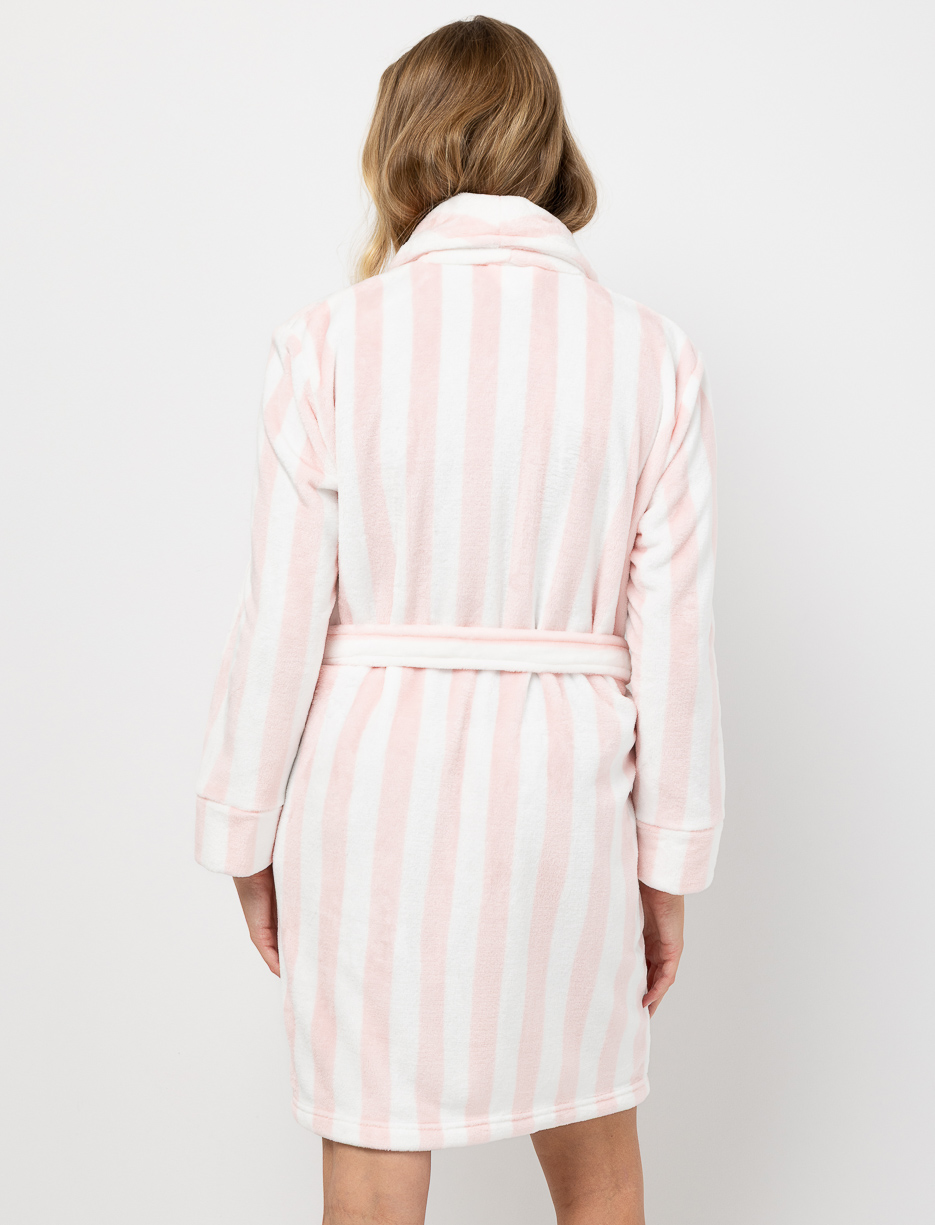 Une robe de chambre en peluche pour femme, douce et rayée, avec ceinture pratique pour un ajustement parfait. Confort idéal pour vos moments de détente à la maison.