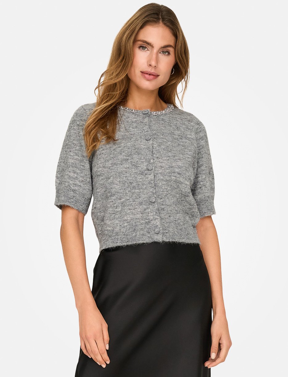 Conçu dans une maille douce et texturée, ce cardigan manches 2/4 se distingue par sa coupe courte moderne et ses boutons recouverts. L’encolure soulignée de strass apporte une finition raffinée.