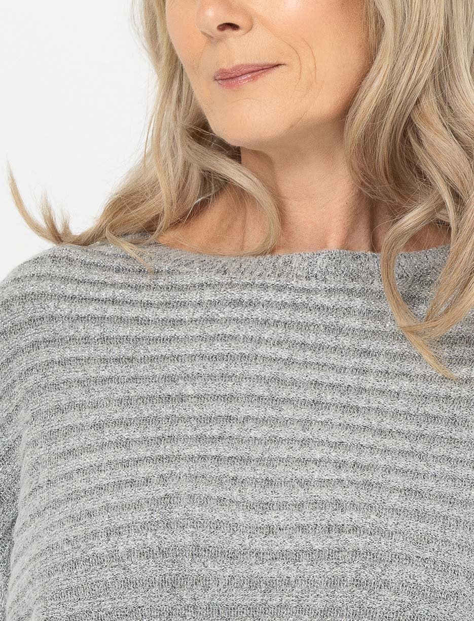 Chic et confortable, ce chandail en tricot texturé brille subtilement grâce à son fil métallisé. Une pièce parfaite pour vos soirées ou pour ajouter une touche raffinée à votre style.