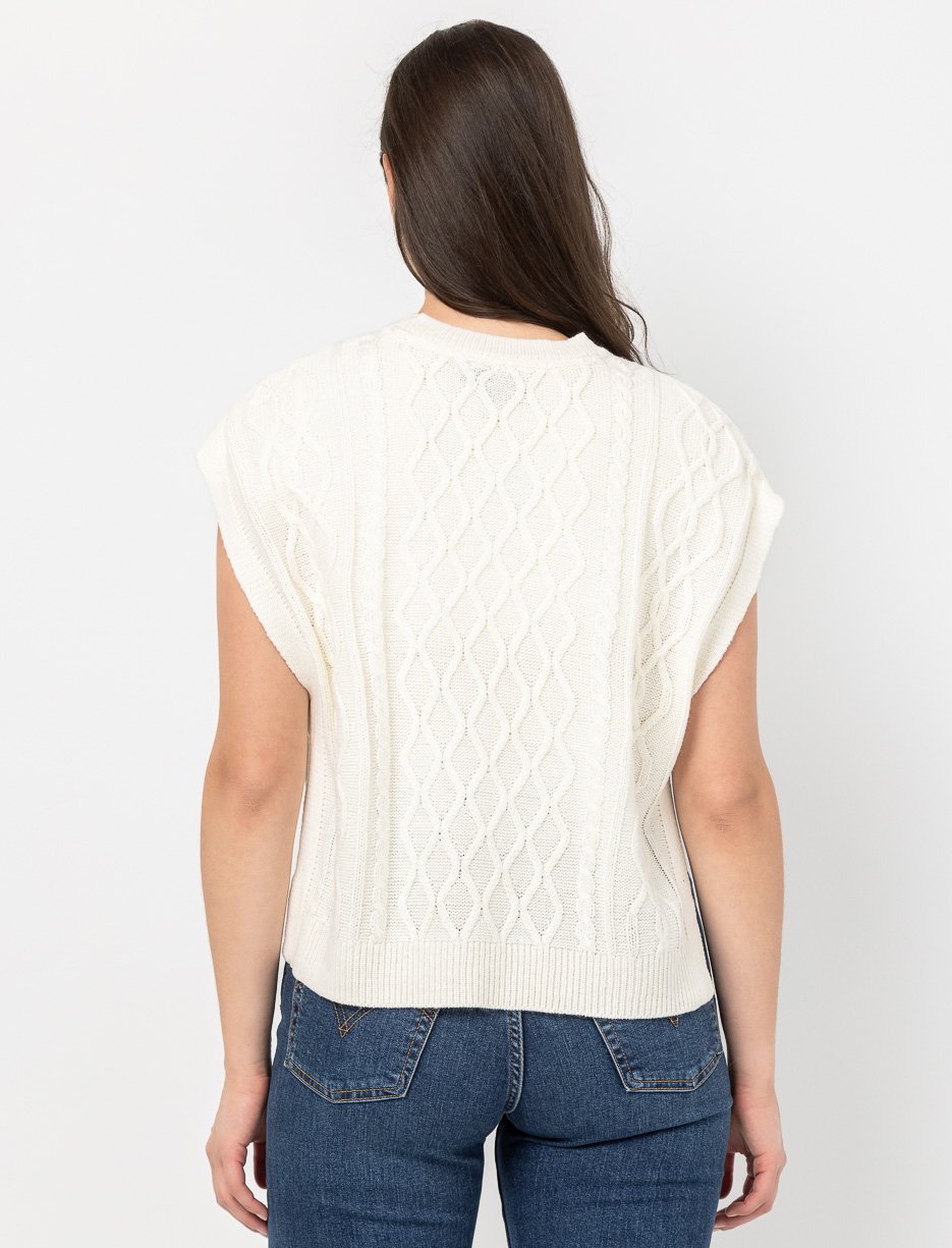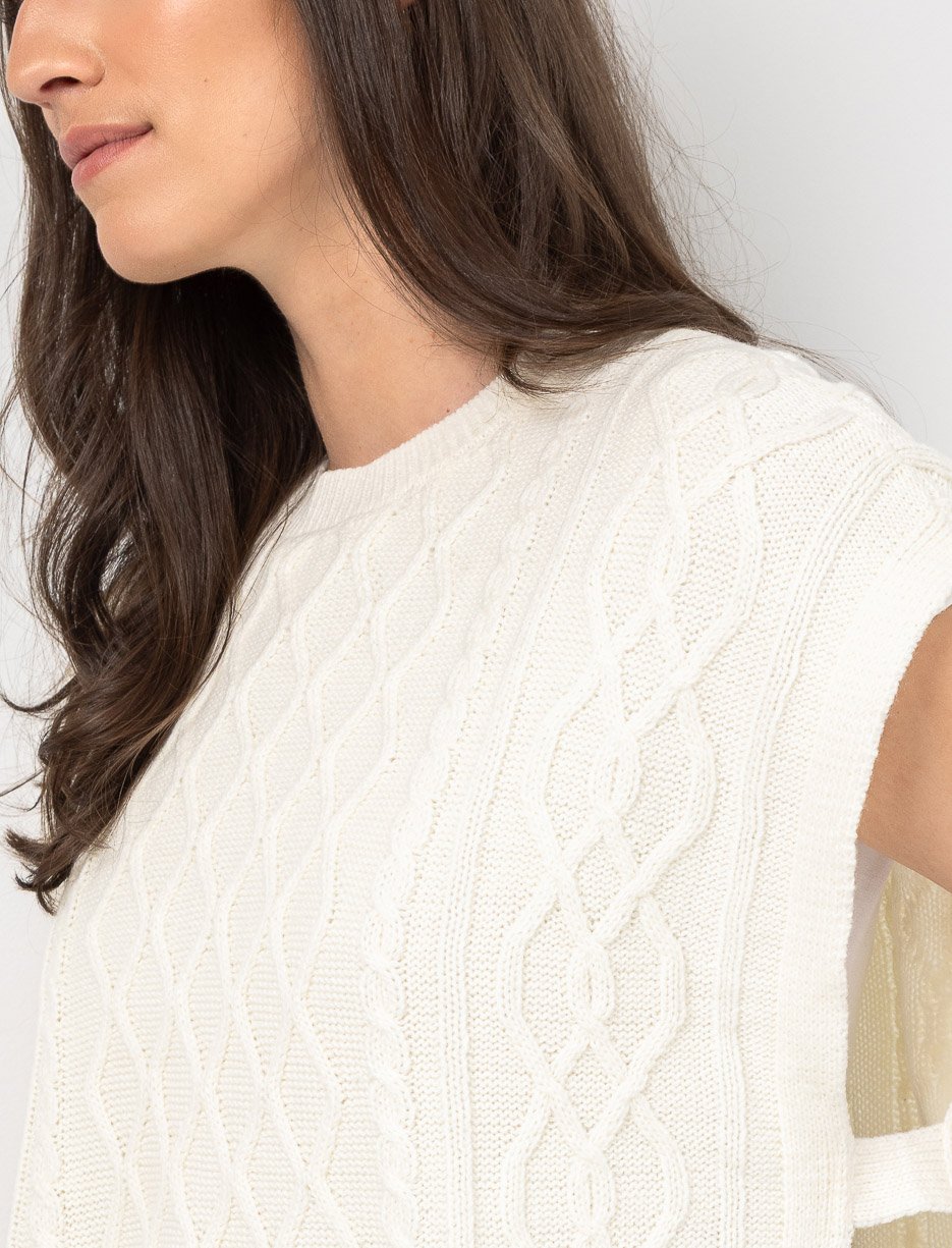 Un tricot sans manches au look moderne, travaillé de motifs torsadés et doté de côtés ouverts pour une superposition facile et tendance.