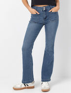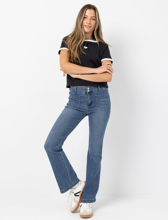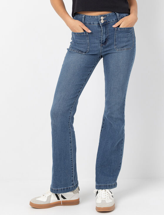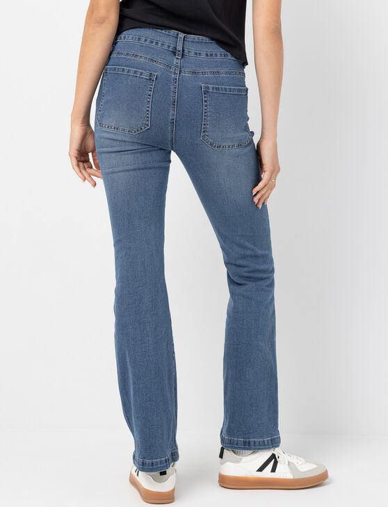 Apportez une touche rétro à votre style avec ce jean évasé à poches plaquées, pensé pour allonger la silhouette tout en offrant confort et liberté de mouvement.