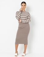 Un essentiel chic qui allonge la silhouette avec élégance. Cette jupe midi épouse vos courbes avec raffinement et s’adapte à toutes vos envies, du bureau aux soirées les plus glamour.