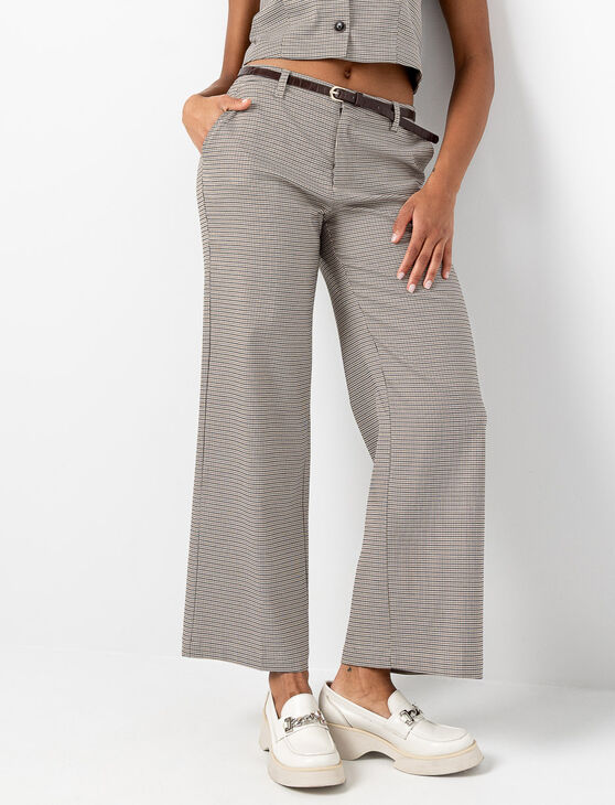 Adoptez un look sophistiqué et confortable avec ce pantalon à jambes larges. Sa ceinture et con motif à petits carreaux, intemporel et élégant, s'associe parfaitement à sa coupe fluide pour une silhouette élancée.