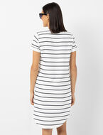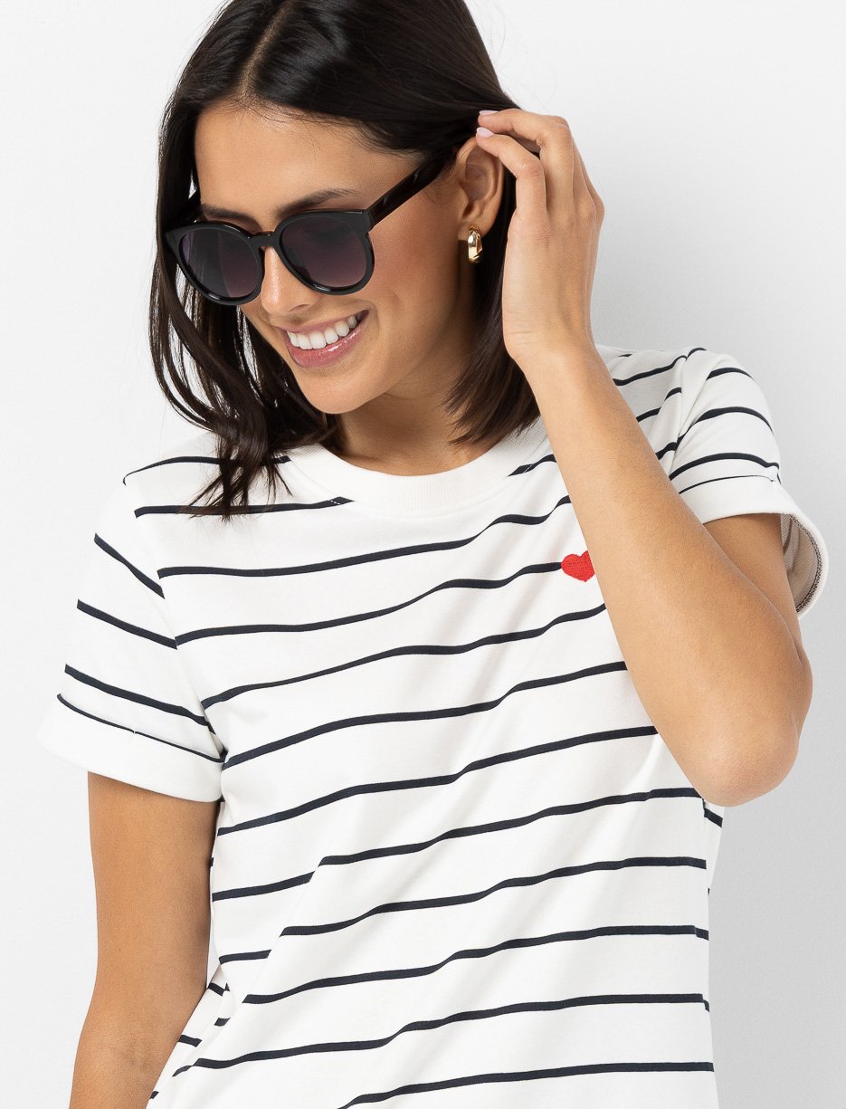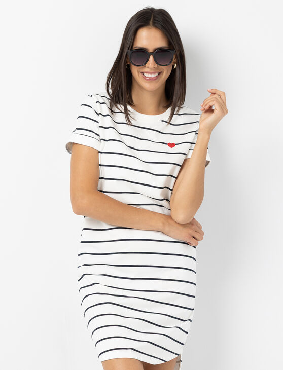 Craquez pour cette robe à rayures rehaussée d’un petit cœur brodé, un clin d’œil tendre et plein de style pour vos journées ensoleillées.