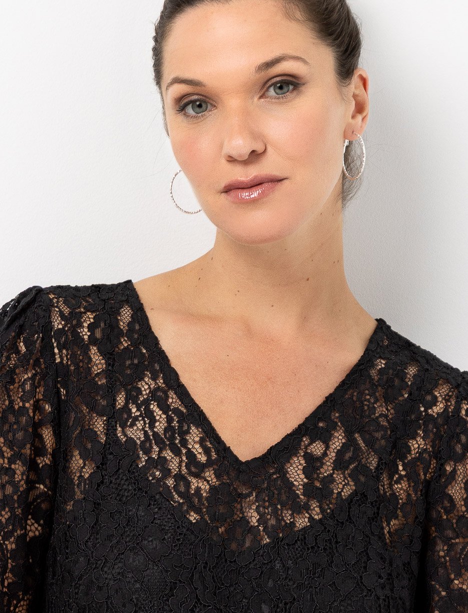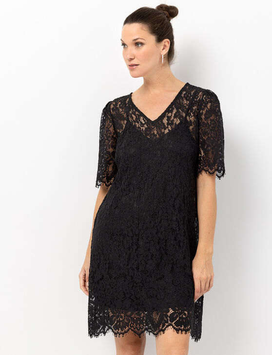 Laissez le charme de la dentelle opérer avec cette robe élégante à col en V. Sa coupe fluide et ses manches délicates en font une alliée parfaite pour briller avec style et légèreté, peu importe l’occasion.