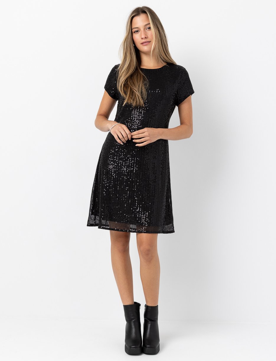 Robe ajustée et évasée en mesh à paillettes, parfaite pour briller lors des soirées festives. Dotée de manches courtes, d’un col rond et d’un joli nœud au dos, elle allie élégance et confort avec une touche scintillante.