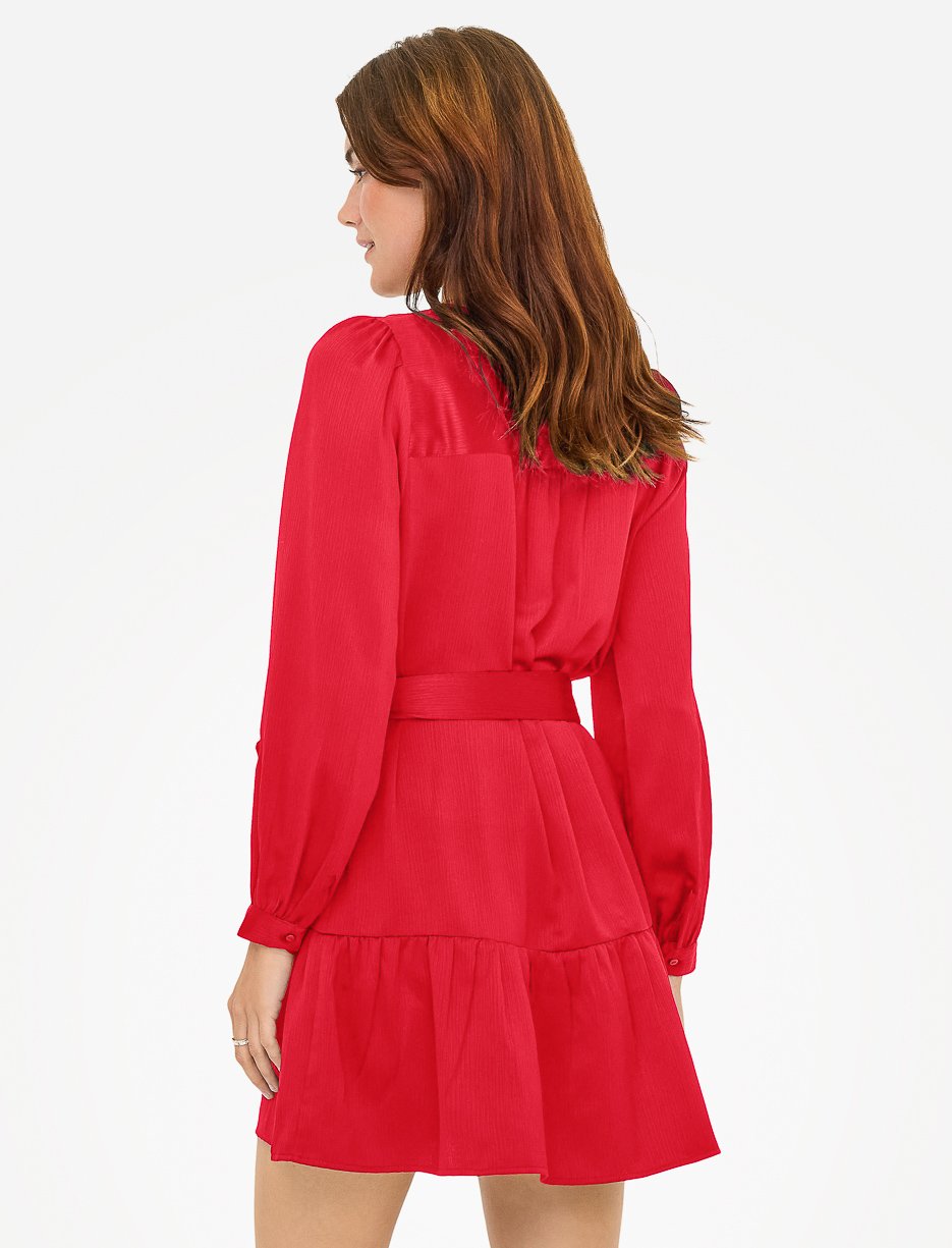Élégante et fluide, cette robe satinée à col V et manches longues est sublimée par une ceinture ton sur ton qui marque la taille. Un modèle raffiné, parfait pour vos sorties ou vos occasions spéciales.