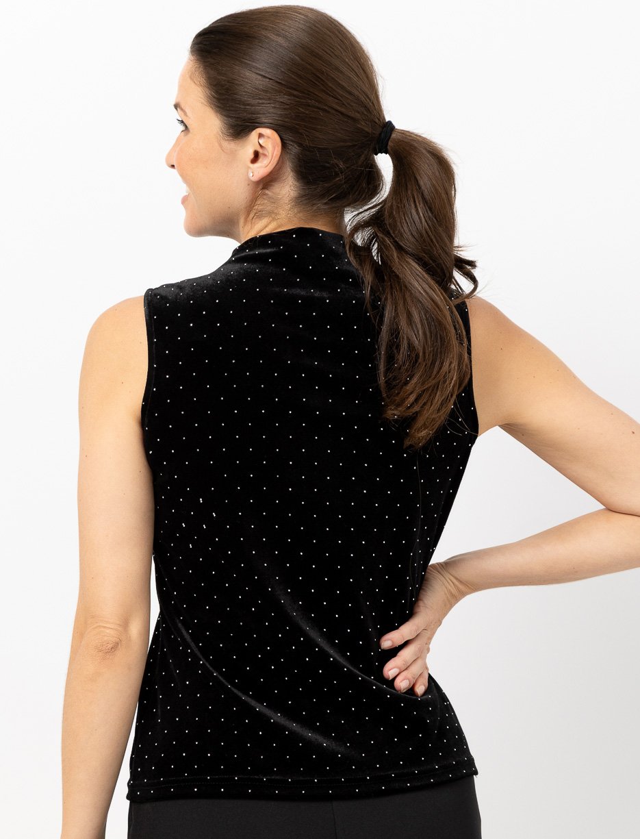 Camisole en velours doux au col montant ornée de strass. Confortable et élégante, elle ajoute une touche raffinée à chaque tenue du jour ou du soir.