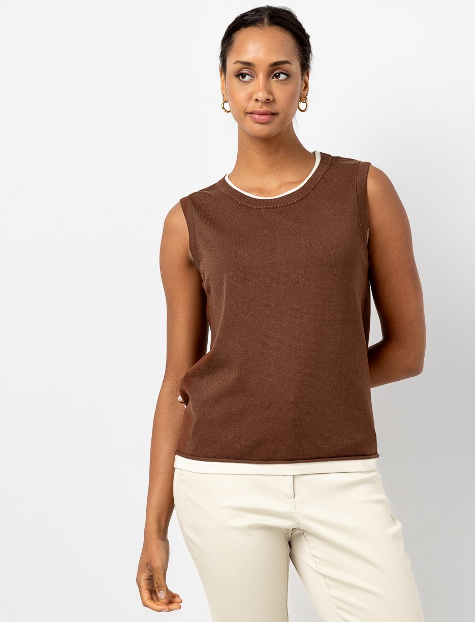 Une camisole sans manches au col rond et à l’ourlet contrastant, parfaite pour apporter une touche moderne et minimaliste à vos tenues.