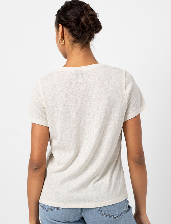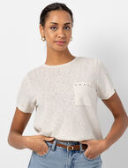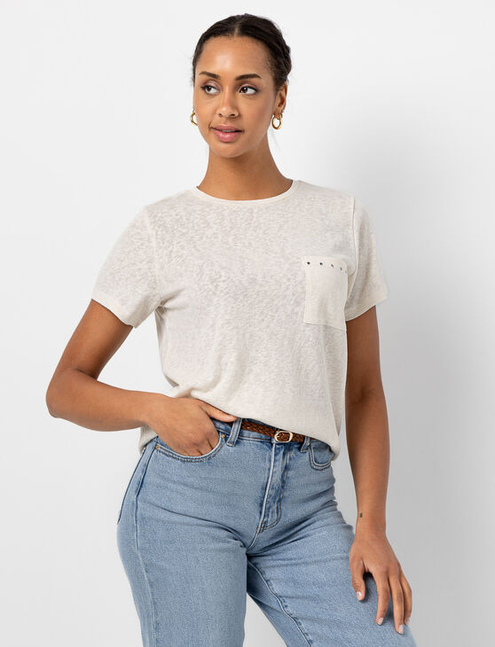 Ajoutez une touche de brillance discrète à vos tenues du quotidien grâce à ce t-shirt à manches courtes, orné de petits clous brillants sur la poche avant. Simple, pratique et facile à agencer.