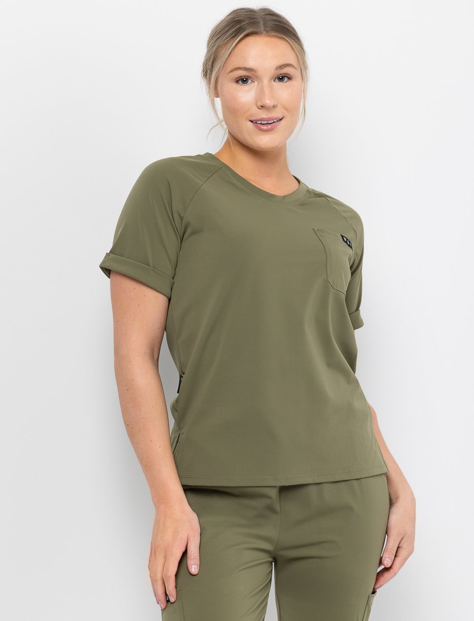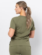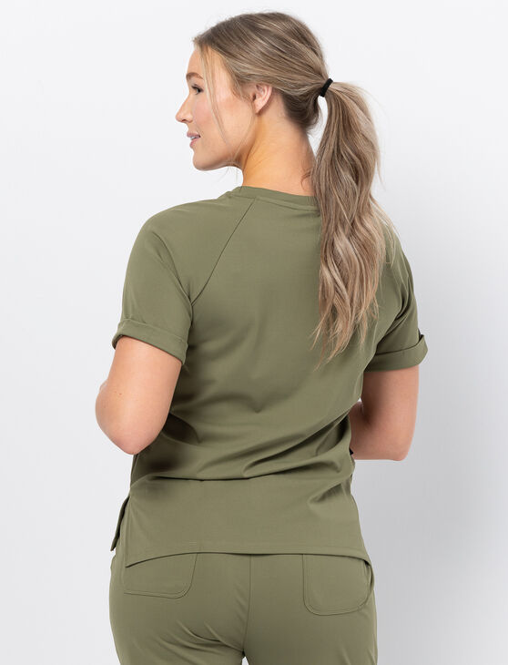 Tunique unie à col rond avec manches courtes à revers et poche pratique au buste. Fentes latérales au bas pour plus d’aisance. Confortable et extensible, idéale pour le travail quotidien.