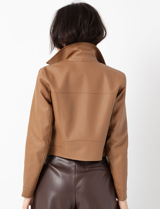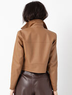 Une veste en similicuir à l'allure structurée et moderne, parfaite pour compléter vos tenues avec une touche audacieuse. Sa coupe courte flatte la silhouette, tandis que la fermeture éclair asymétrique ajoute du caractère.