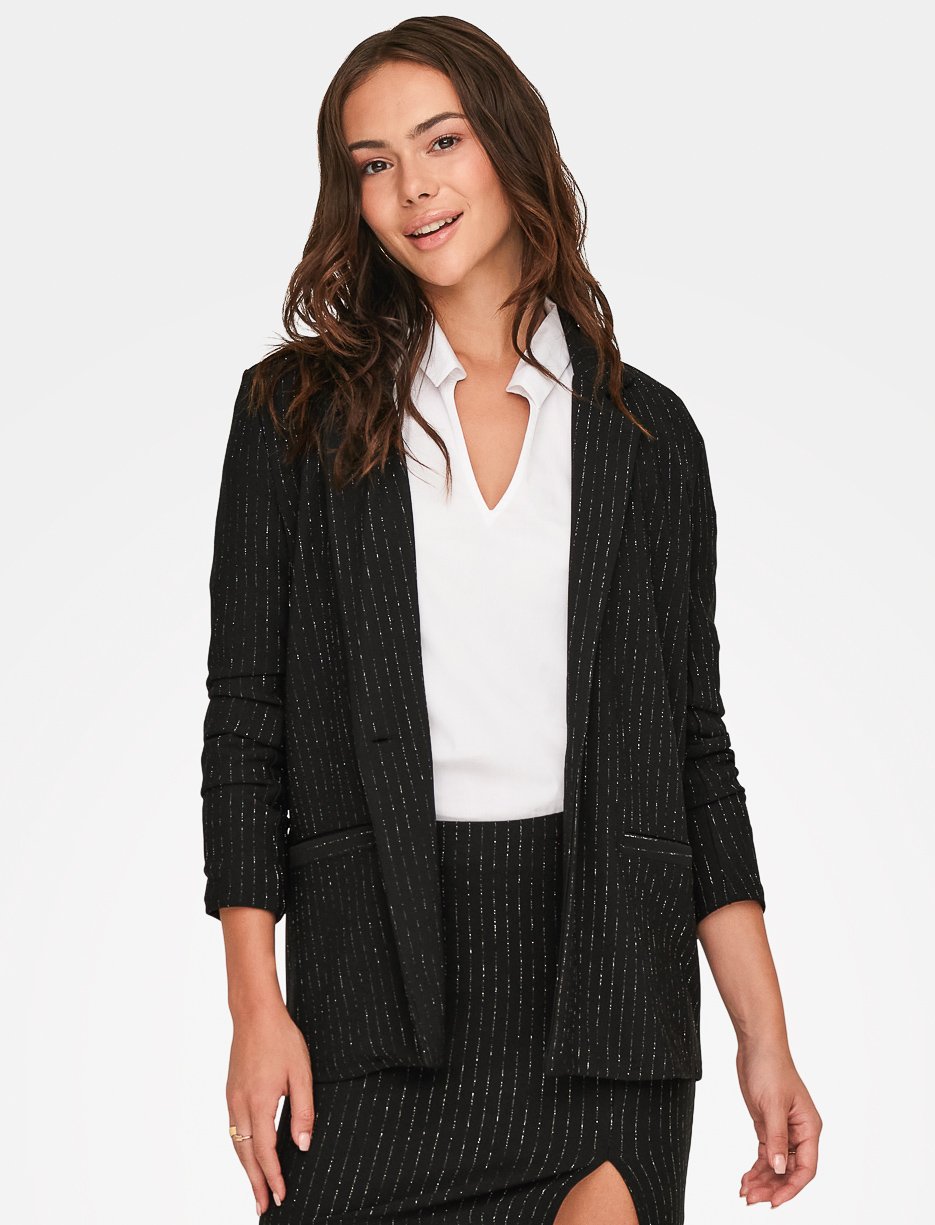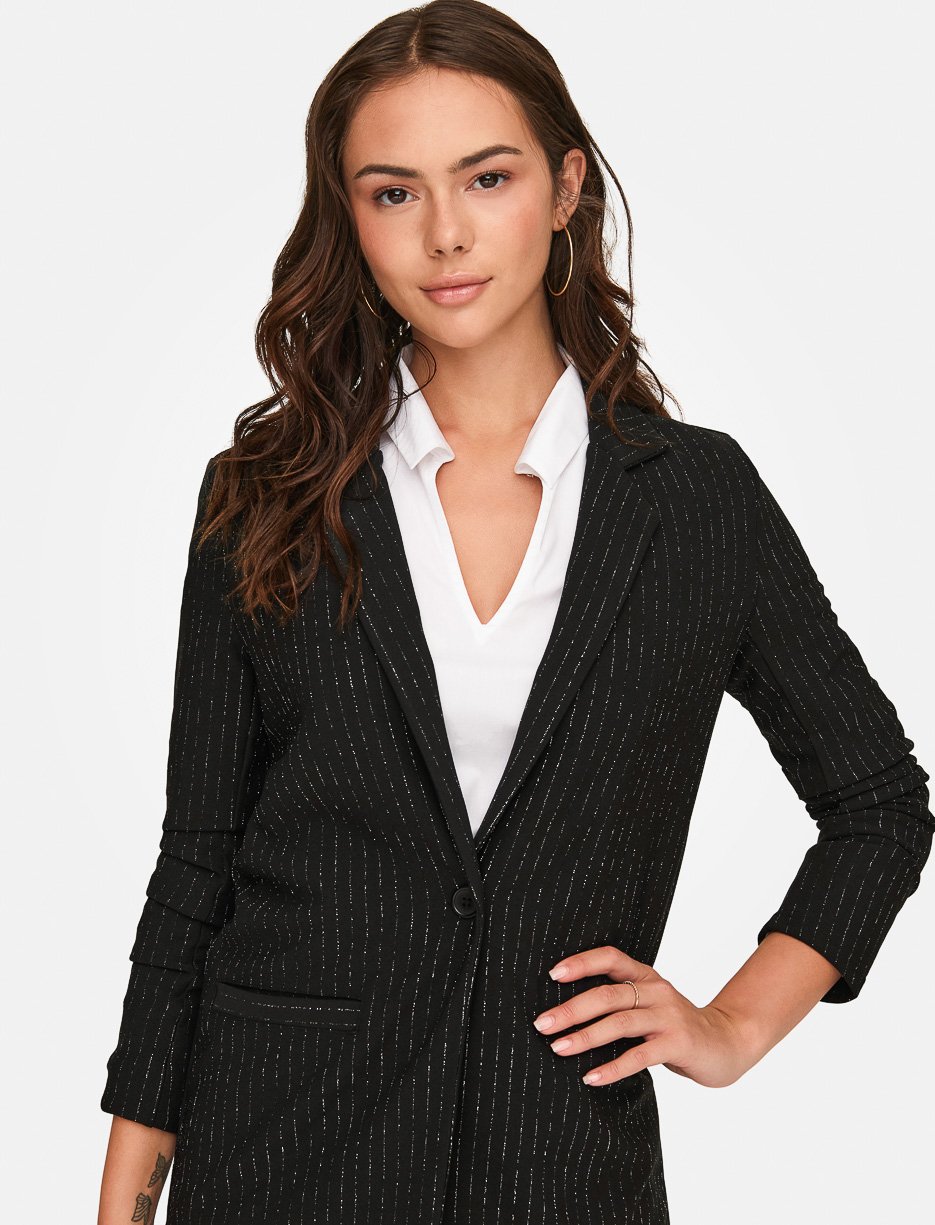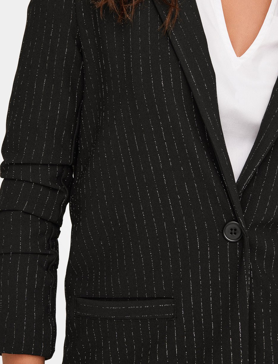 Affirmez votre style avec ce veston à rayures brillantes, parfait pour rehausser une tenue professionnelle ou sophistiquée. Sa coupe ajustée et ses manches froncées ajoutent une touche moderne et féminine.