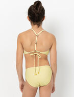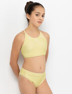 Ce maillot 2 pièces au col haut est parfait pour les journées d’été actives. Ses bretelles croisées et nouées au dos assurent confort et maintien, tandis que les détails plissés sur le bas ajoutent une touche mignonne et stylée.