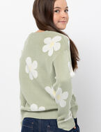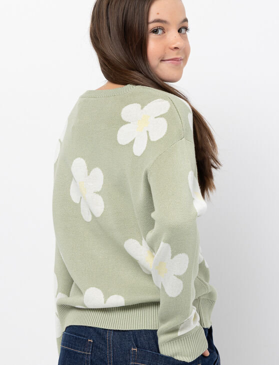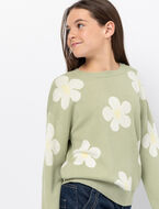 Un chandail en tricot doux à manches longues et épaules tombantes. Son col rond et ses fleurs délicates ajoutent une touche de charme aux journées fraîches.