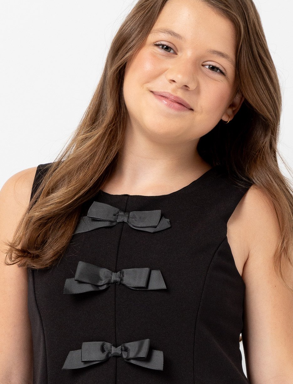 Apportez une touche charmante à sa garde-robe avec cette robe sans manches ornée de jolis nœuds, idéale pour briller lors des occasions spéciales.