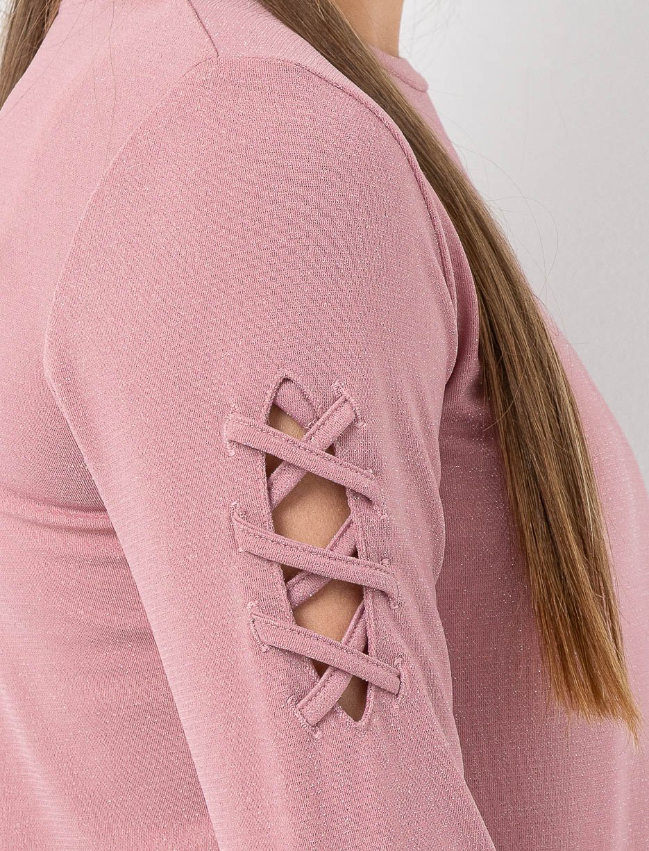 Apportez une touche d’éclat aux tenues du quotidien avec ce t-shirt scintillant à manches longues, rehaussé de détails entrecroisés sur les bras pour un style moderne et raffiné.