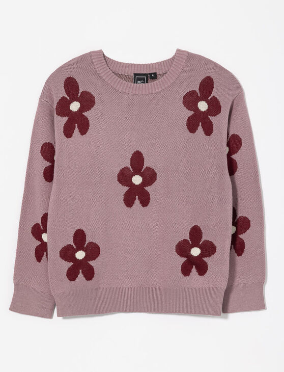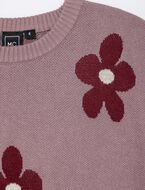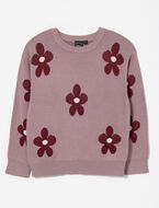 Un chandail en tricot doux à manches longues et épaules tombantes. Son col rond et ses fleurs délicates ajoutent une touche de charme aux journées fraîches.