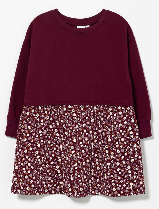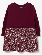 Une robe confortable au haut ouaté uni et à la jupe fleurie, parfaite pour allier douceur et coquetterie toute la journée.