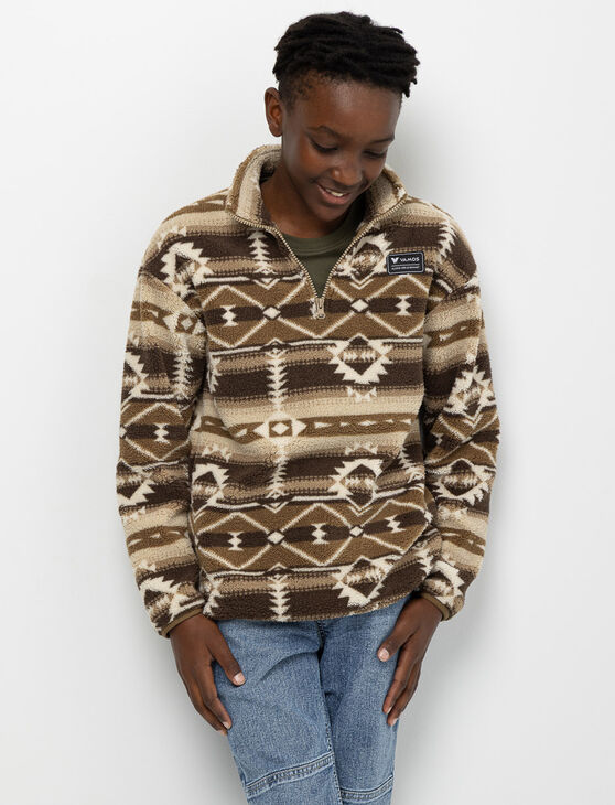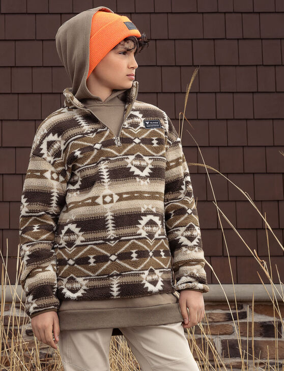 Offrez à votre garçon un confort douillet avec ce chandail en polar orné d’un imprimé aztèque. Son demi-zip pratique et sa coupe décontractée en font un choix idéal pour ses activités de tous les jours.