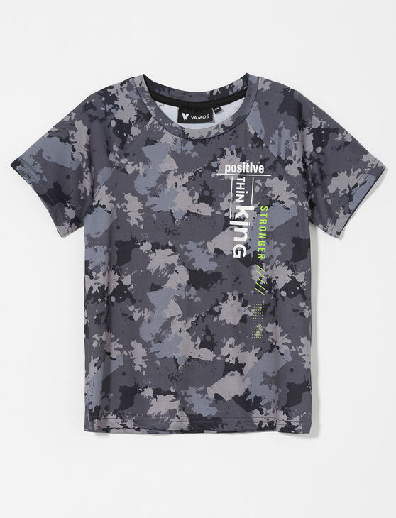 T-shirt de sport à col rond avec motif de camouflage sur l'ensemble et un imprimé à l’avant. Léger et confortable, il est parfait pour rester actif avec style.