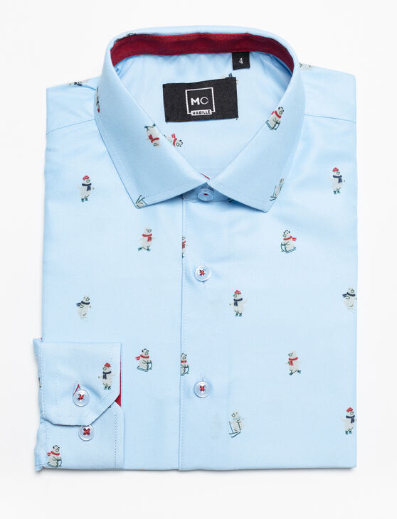 une chemise ludique pour petit garçon, ornée de motifs hivernaux amusants, idéale pour ajouter une touche joyeuse et festive à son style.