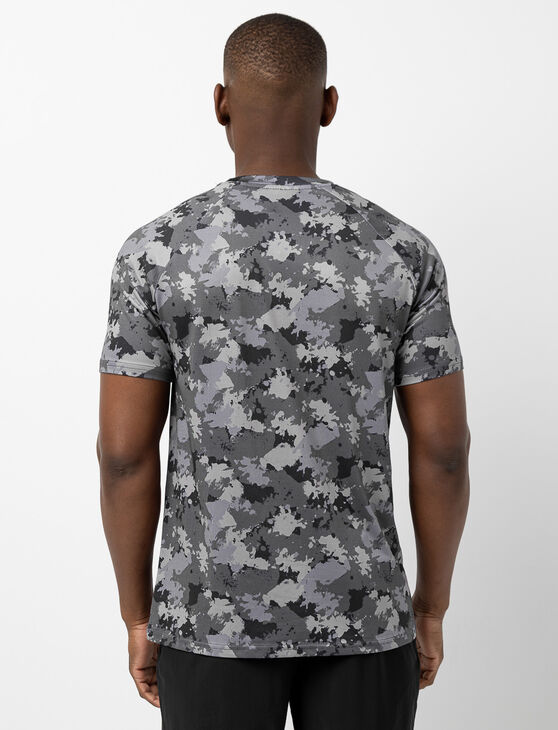 T-shirt de sport à col rond avec motif de camouflage sur l'ensemble et un imprimé à l’avant. Léger et confortable, il est parfait pour rester actif avec style.