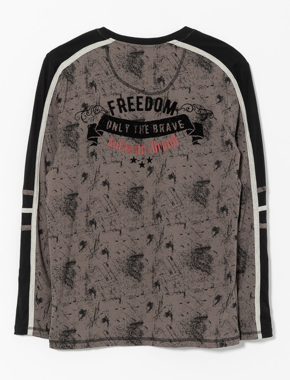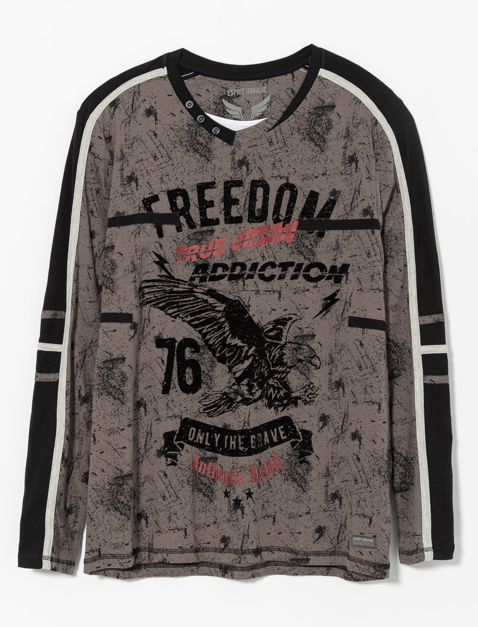 Un t-shirt en jersey à col rond avec boutons et imprimé avant. Les bandes noires sur les manches et les épaules ajoutent une touche moderne au look décontracté.