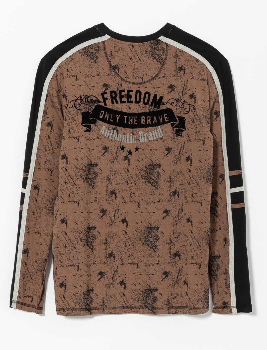 Un t-shirt en jersey à col rond avec boutons et imprimé avant. Les bandes noires sur les manches et les épaules ajoutent une touche moderne au look décontracté.