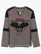 Un t-shirt en jersey texturé à col V boutonné et manches blocs de couleur. L’imprimé avant apporte une touche audacieuse au look décontracté.