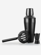 Ensemble élégant en acier inoxydable noir comprenant un mélangeur (500 mL), un doseur double (15 mL + 30 mL) et une passoire. Présenté dans une jolie boîte cadeau, parfait pour offrir.