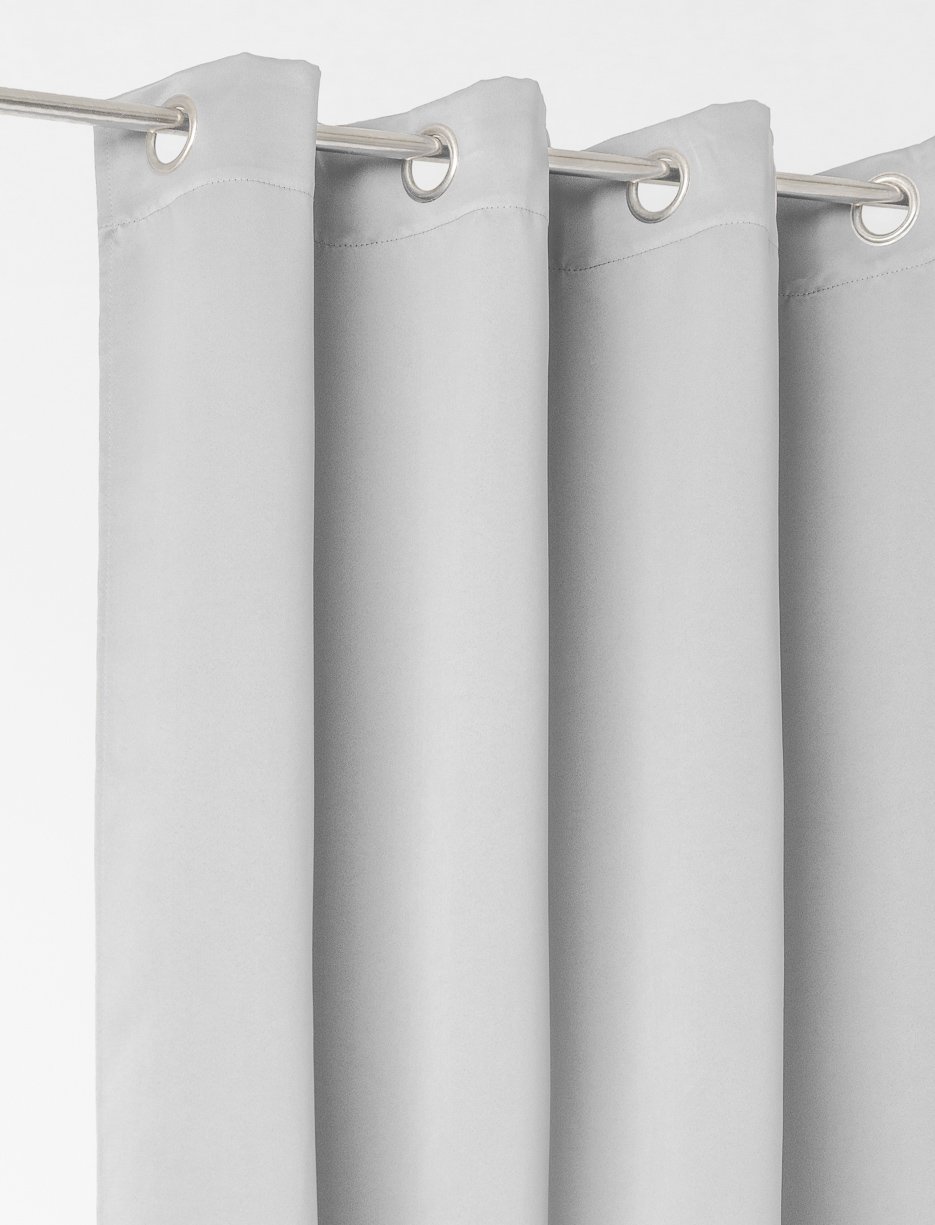 Panneau de rideau coupe-lumière avec 8 œillets de métal argent mat. Mesure 52x84 po (132x213 cm) et comporte un ourlet de 1 cm. Conçu pour apporter une touche moderne et élégante à la pièce tout en bloquant efficacement la lumière.