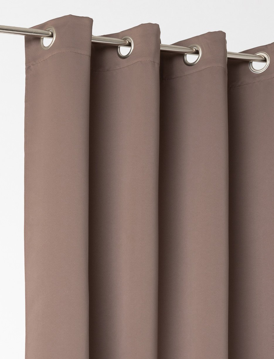 Panneau de rideau coupe-lumière avec 8 œillets de métal argent mat. Mesure 52x84 po (132x213 cm) et comporte un ourlet de 1 cm. Conçu pour apporter une touche moderne et élégante à la pièce tout en bloquant efficacement la lumière.
