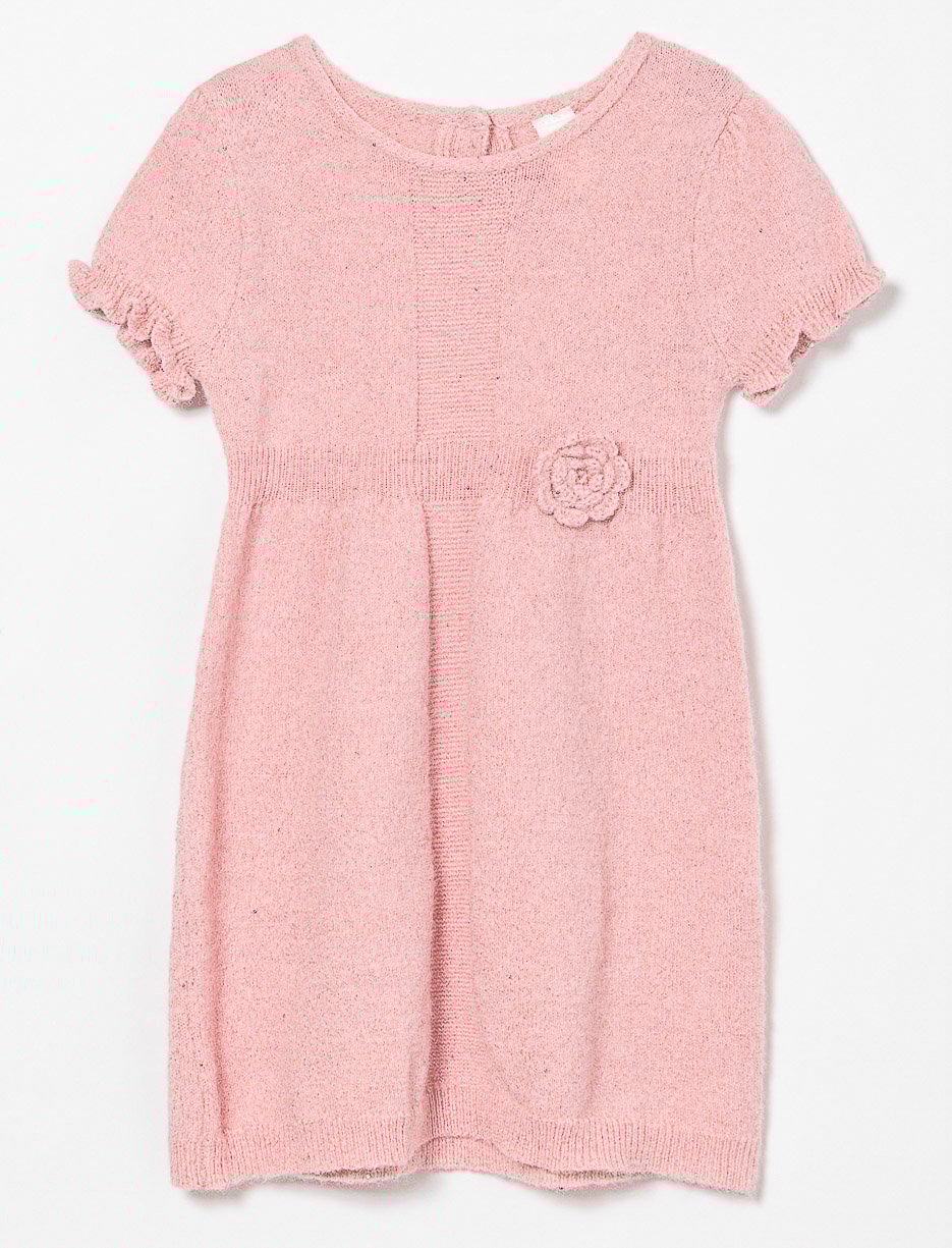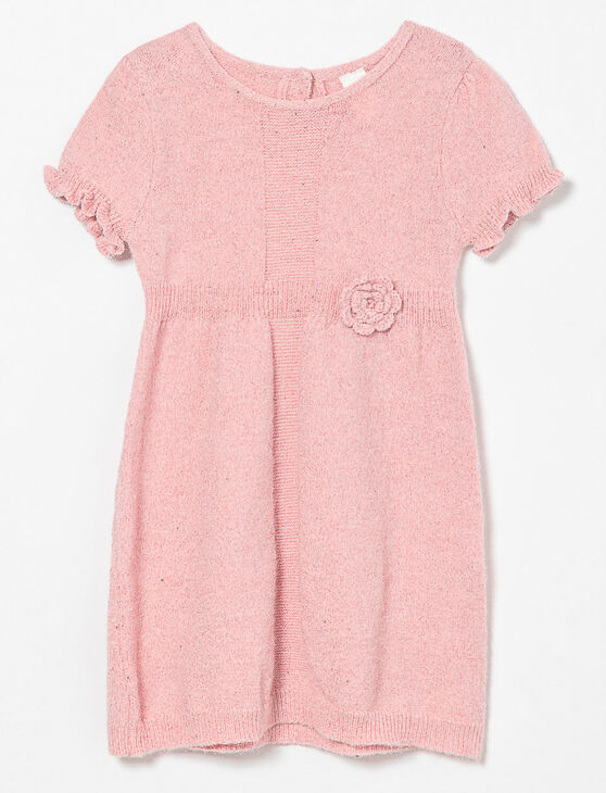 Cette robe en tricot pour fille séduit par sa douceur et son éclat. Les fils lurex et les fines paillettes offrent un fini scintillant, tandis que la petite fleur à la taille et les volants délicats ajoutent une touche pleine de charme.