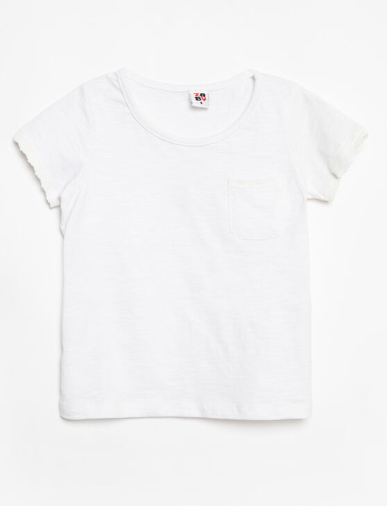Doux et raffiné, ce t-shirt est idéal pour votre chérie! Avec ses manches bordées de dentelle et sa poche délicate, il allie confort et élégance. C'est un choix parfait pour un look charmant au quotidien.