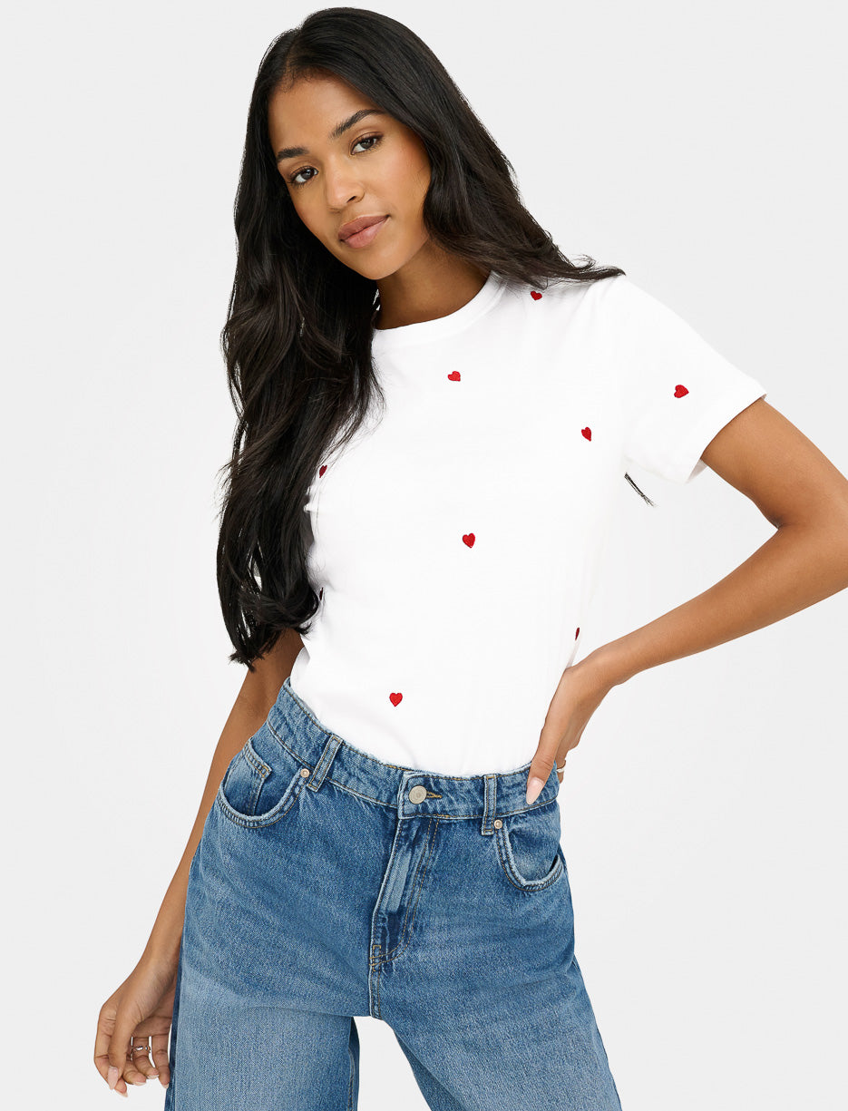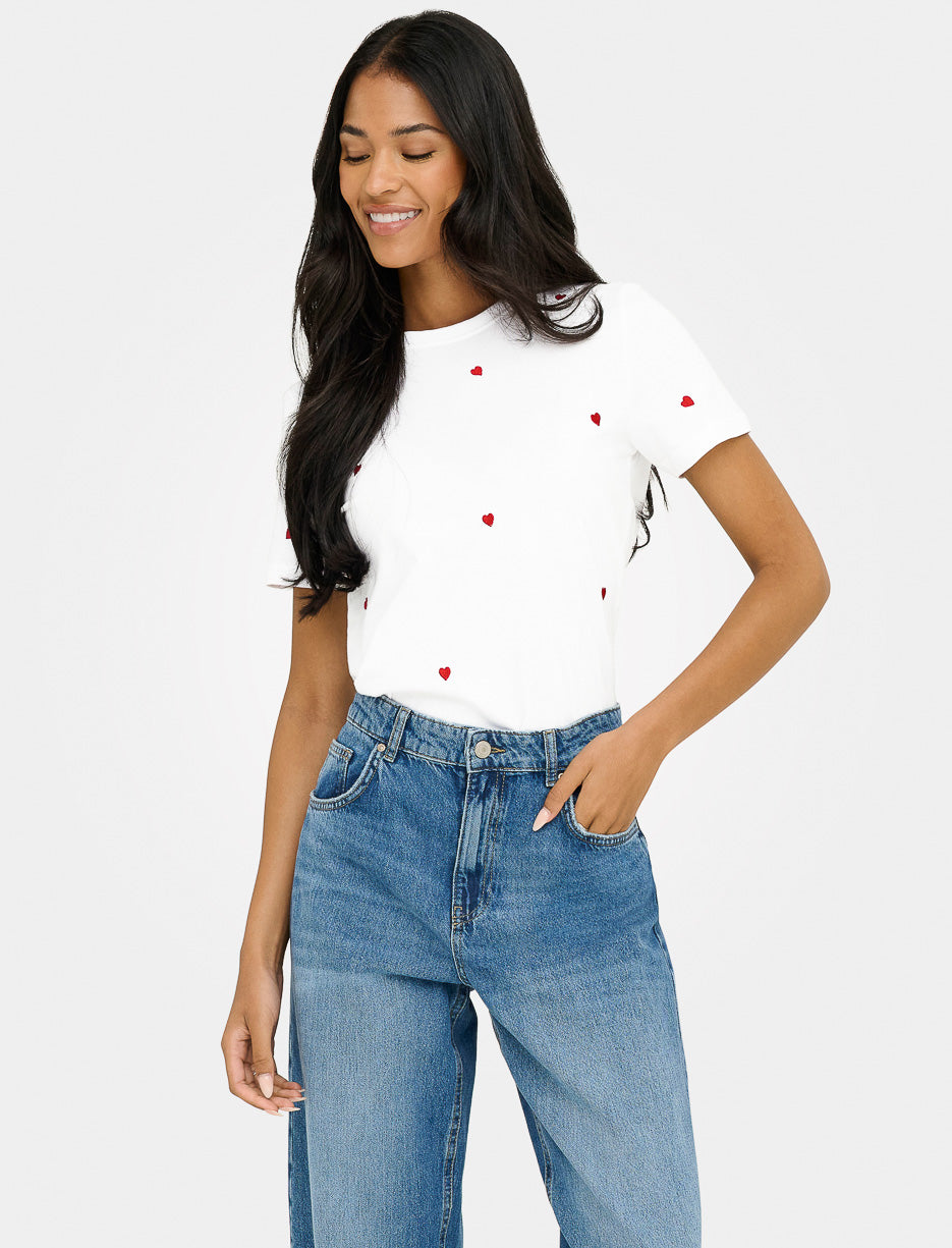 T-shirt orné de petits cœurs brodés ajoutant une touche tendre et féminine. Sa coupe classique et son style épuré en font un essentiel à porter en toute saison.
