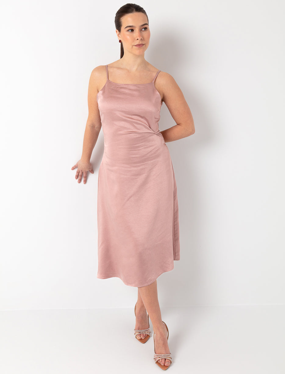 Cette robe midi satinée incarne l’élégance minimaliste avec ses fines bretelles et sa coupe fluide. Un modèle raffiné qui se prête parfaitement aux soirées ou aux occasions spéciales.