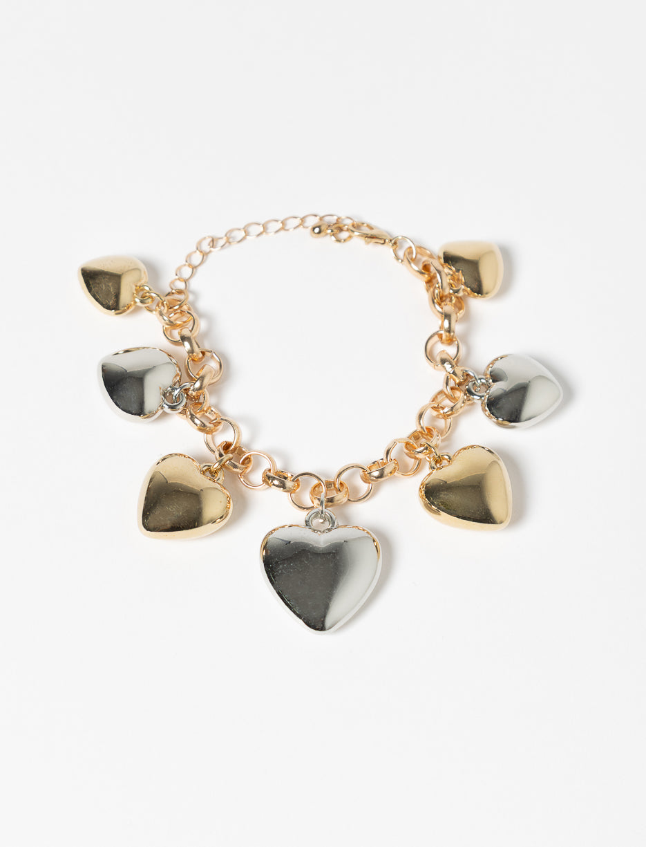 Un bijou plein de charme ! Ce bracelet à breloques cœurs dorés et argentés apporte une touche romantique et lumineuse à votre poignet.