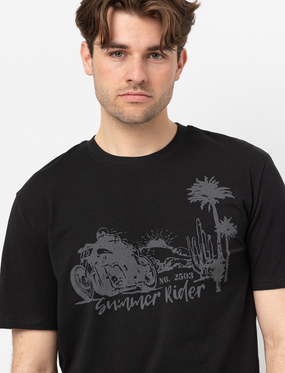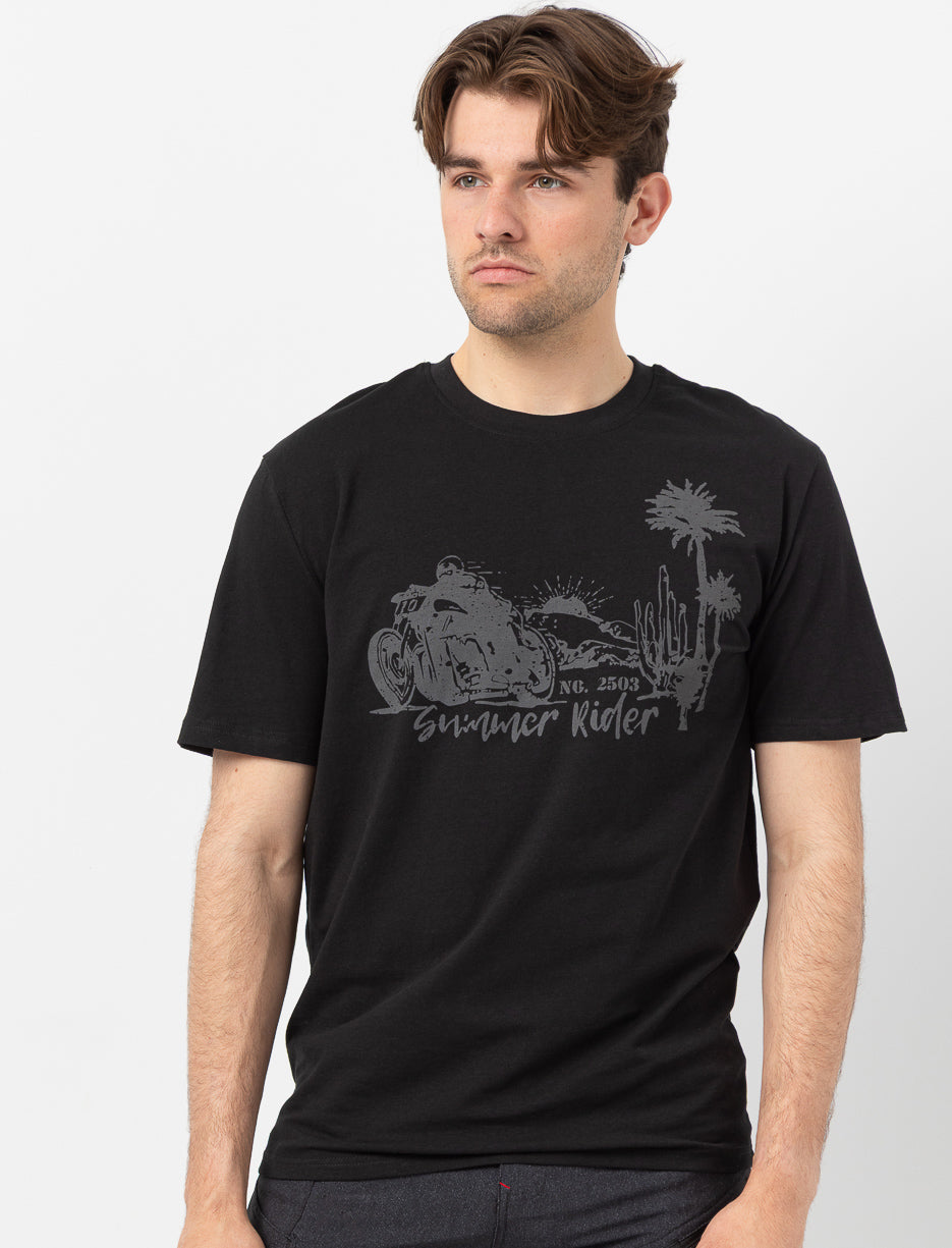 Ce t-shirt mise sur l'esprit d'aventure avec son imprimé de moto et palmiers. Un clin d’œil à l’évasion estivale pour un style décontracté et assumé.