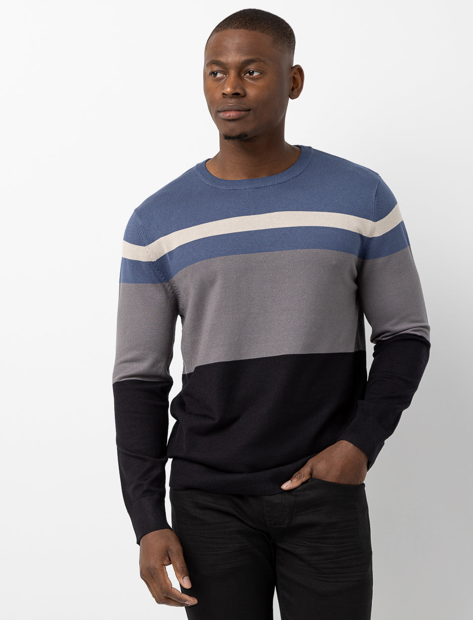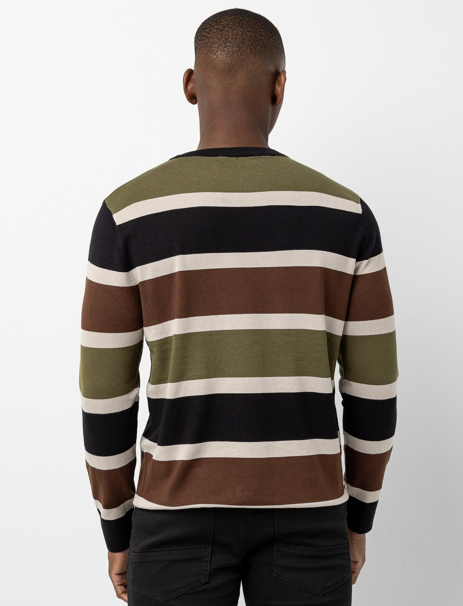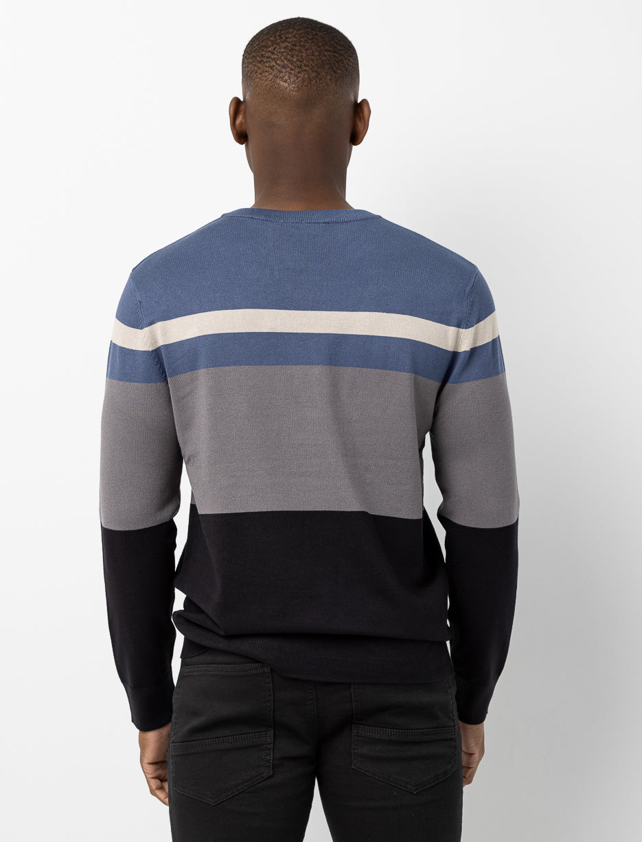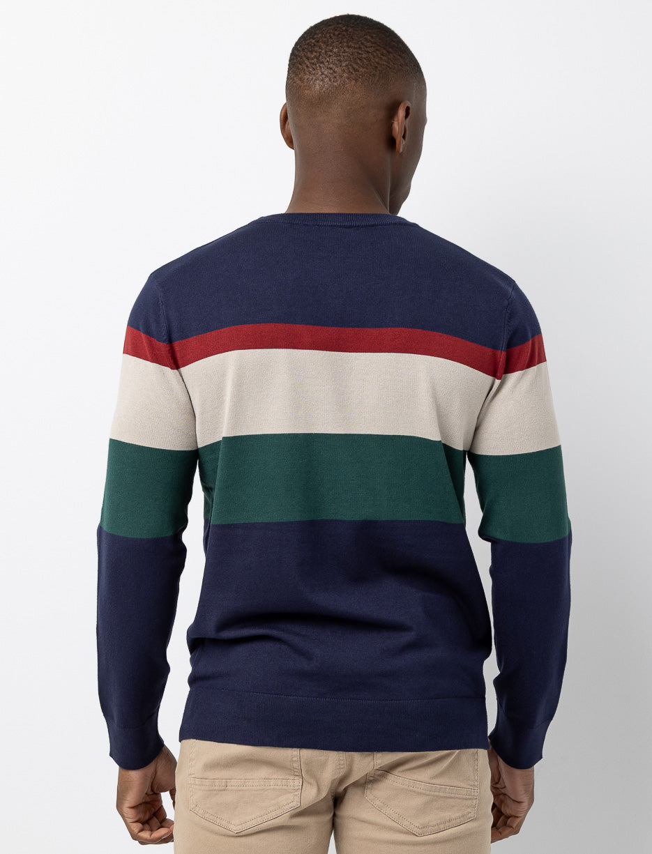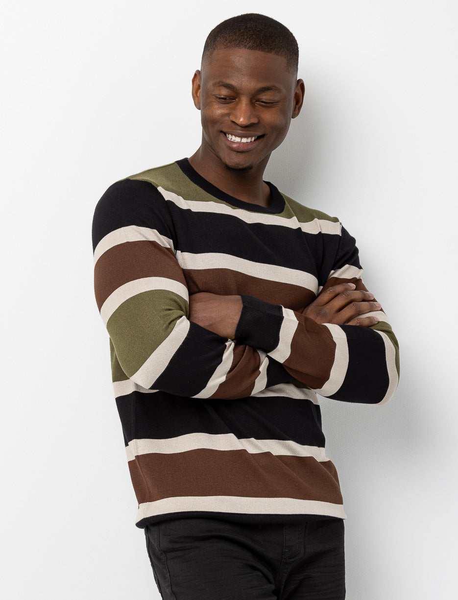 Ce chandail de tricot à rayures pour homme allie style et confort. Son col rond classique et sa coupe polyvalente en font un essentiel pour un look chic au quotidien