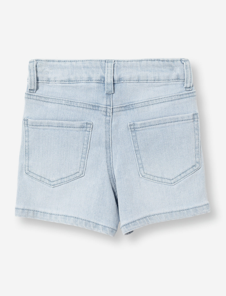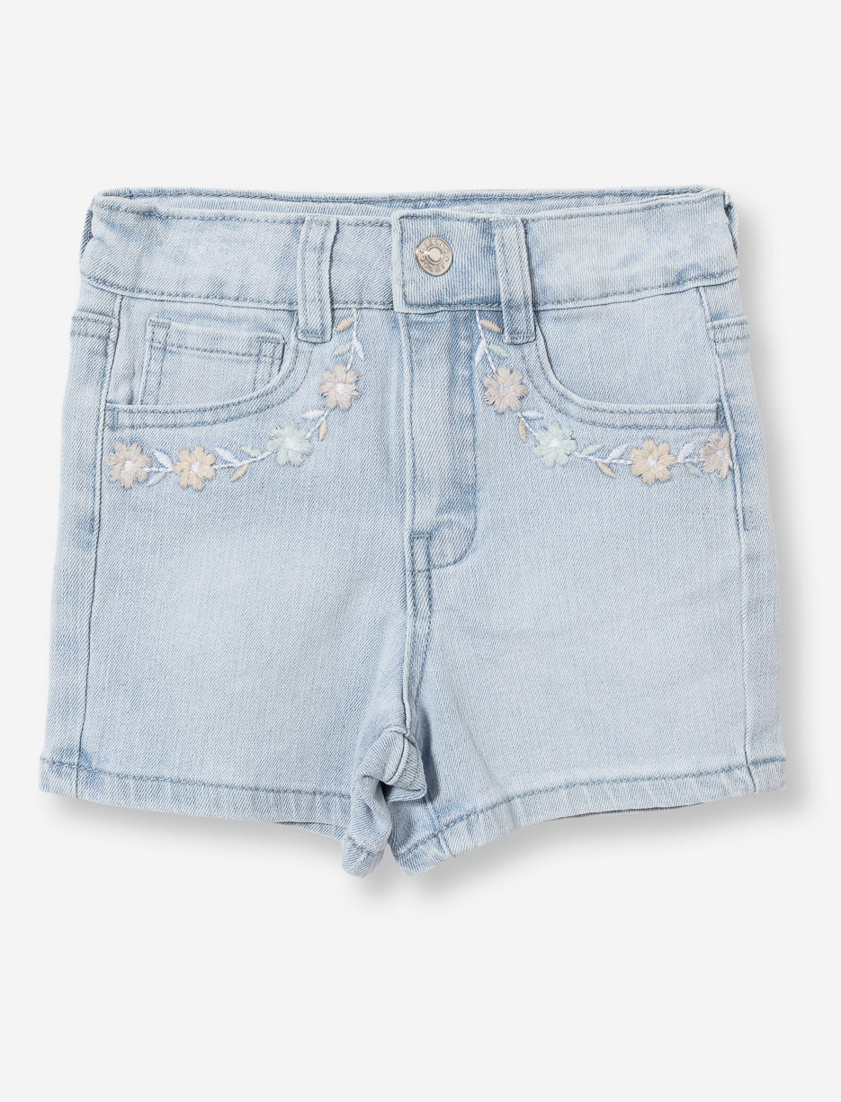 Ce short en denim stretch est le compagnon idéal pour les petites filles actives. Avec sa coupe régulière, ses cinq poches pratiques et sa délicate broderie florale, il combine style et confort pour des journées sans souci.