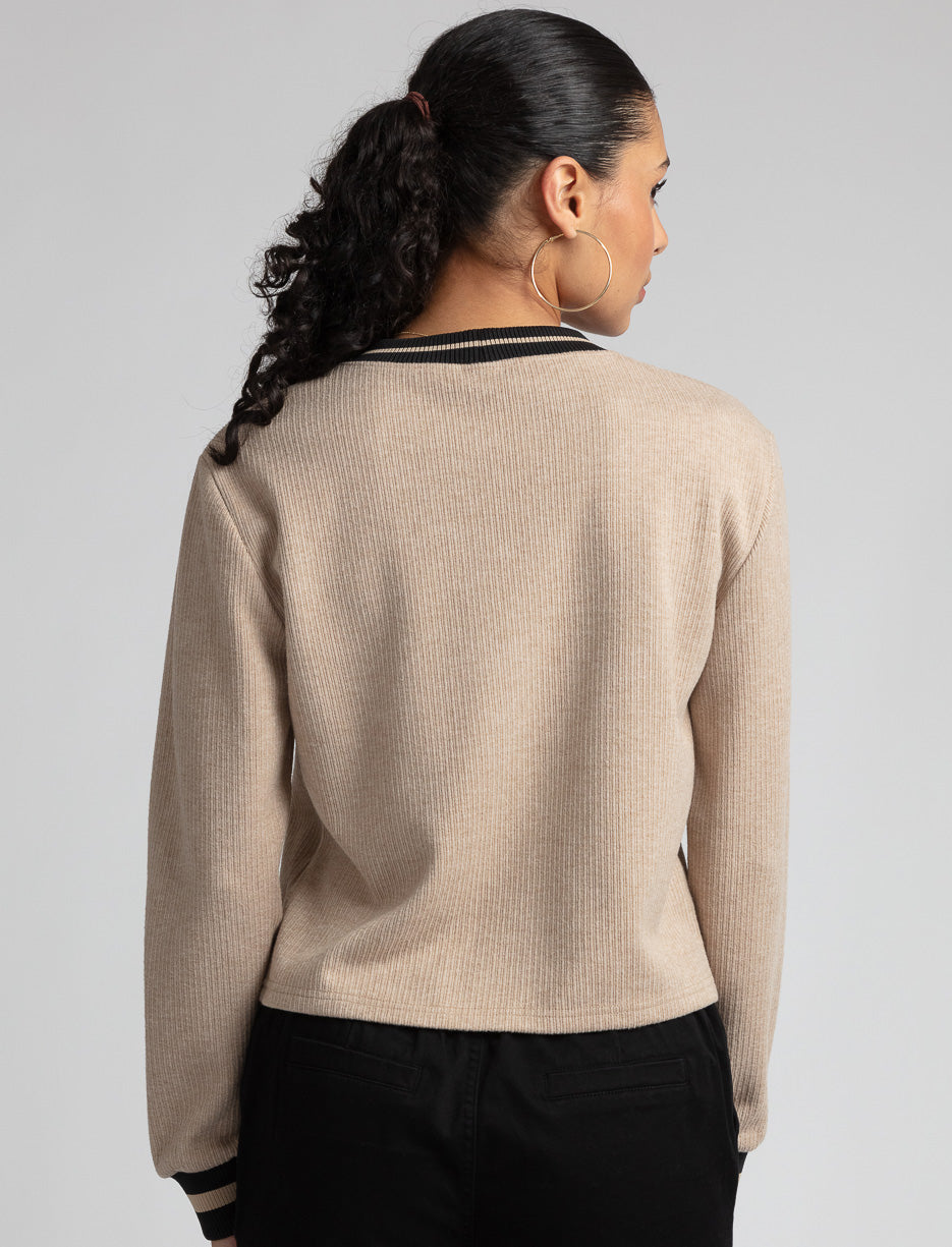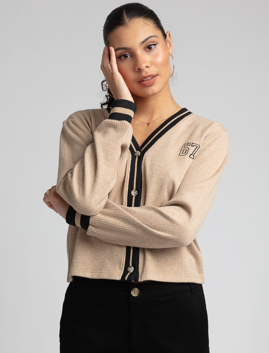 Ce cardigan stylé présente un design intemporel avec son look universitaire, offrant un mélange chic de nostalgie et de mode moderne. Parfait pour superposer, ses tons neutres s'associent sans effort à tout ensemble.