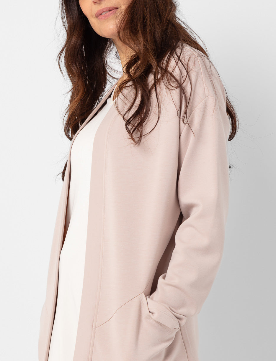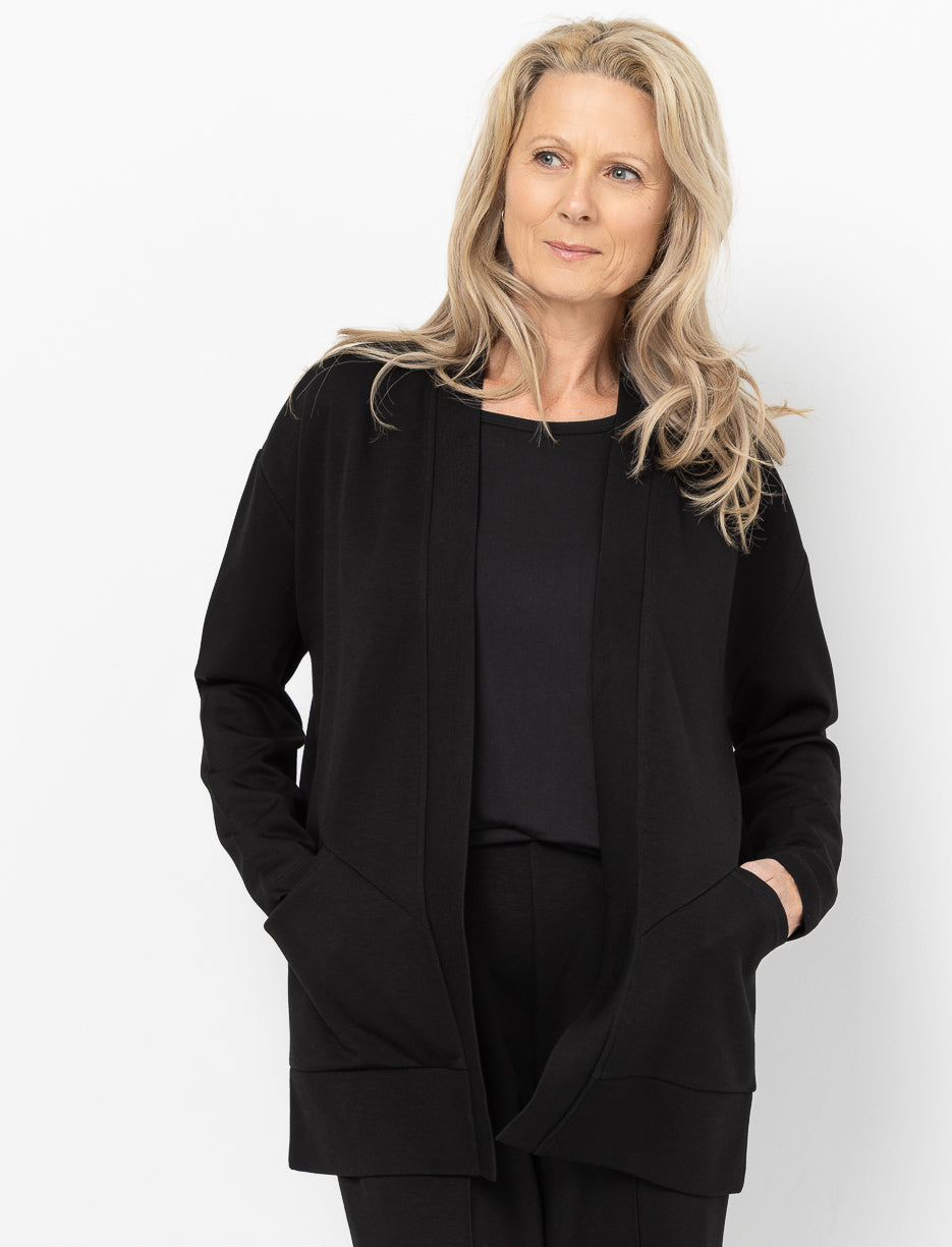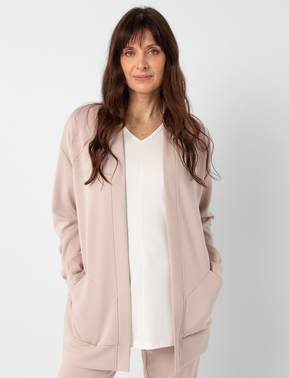 Ce cardigan en tissu scuba offre douceur, maintien et confort au quotidien. Sa texture souple garde une belle forme tout en vous permettant de bouger librement, pour un style soigné et facile à agencer.