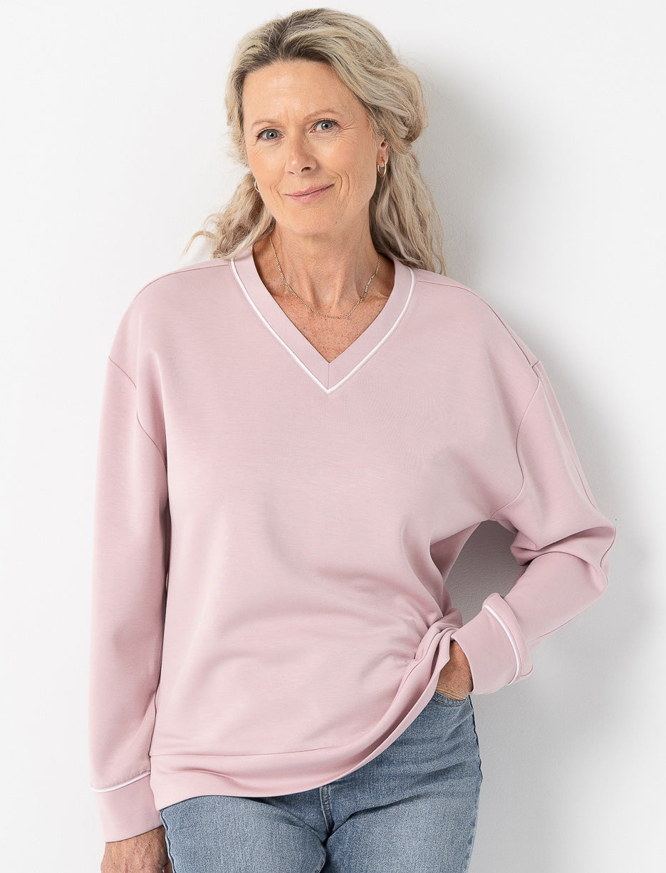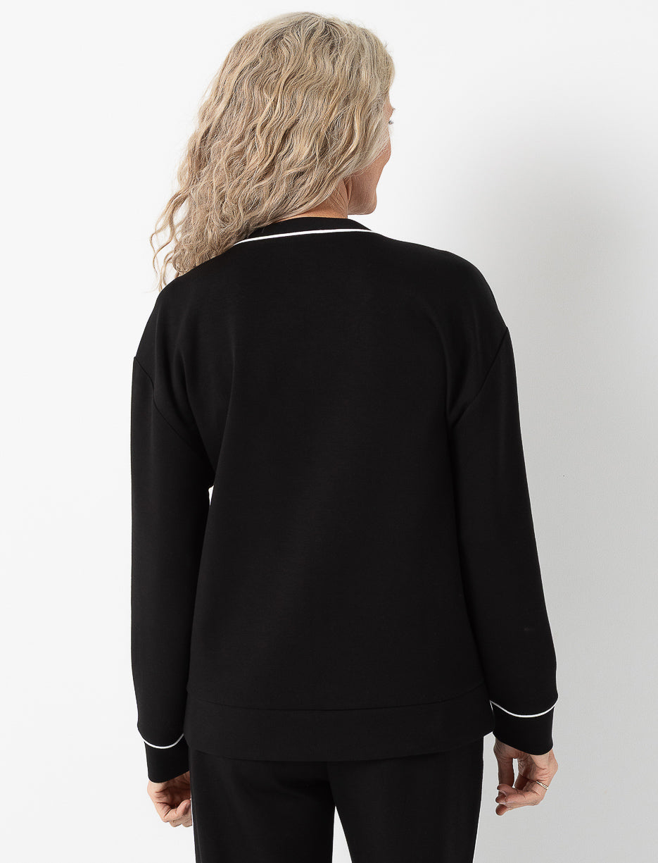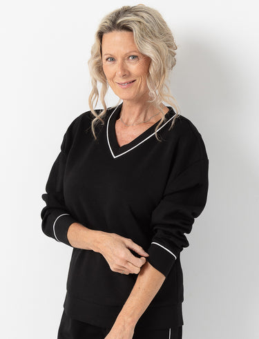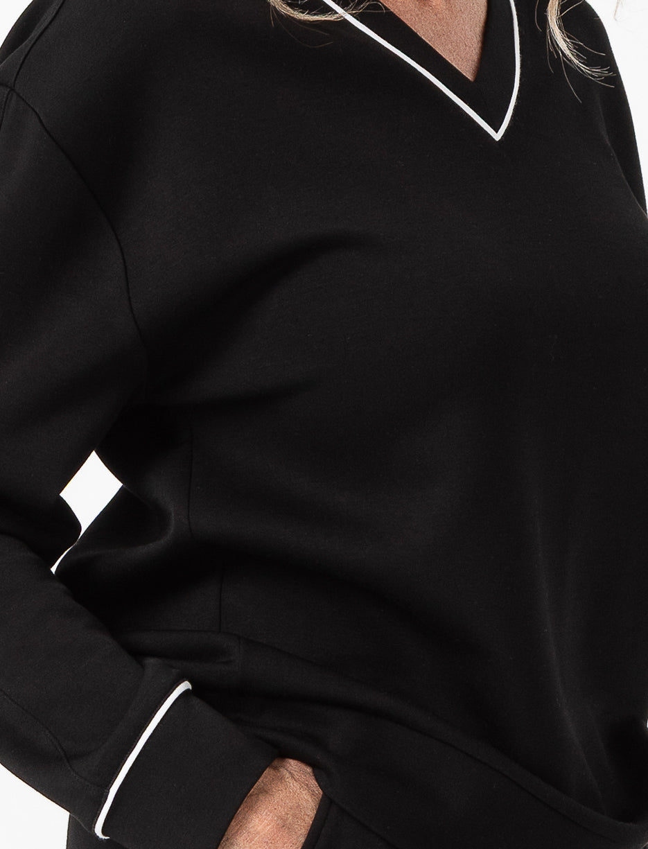 Un chandail à col en V rehaussé d’un liseré contrastant pour une touche sport-chic. Avec sa coupe décontractée et ses manches longues, il combine confort et élégance sans effort.