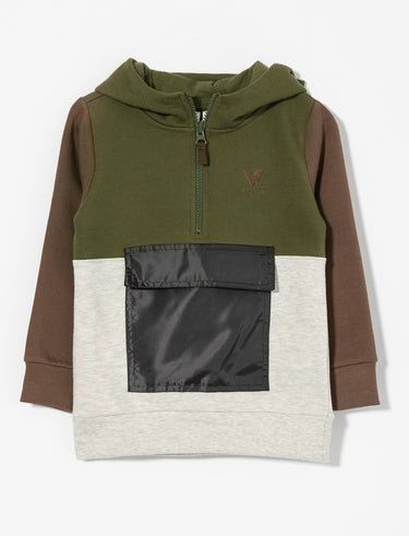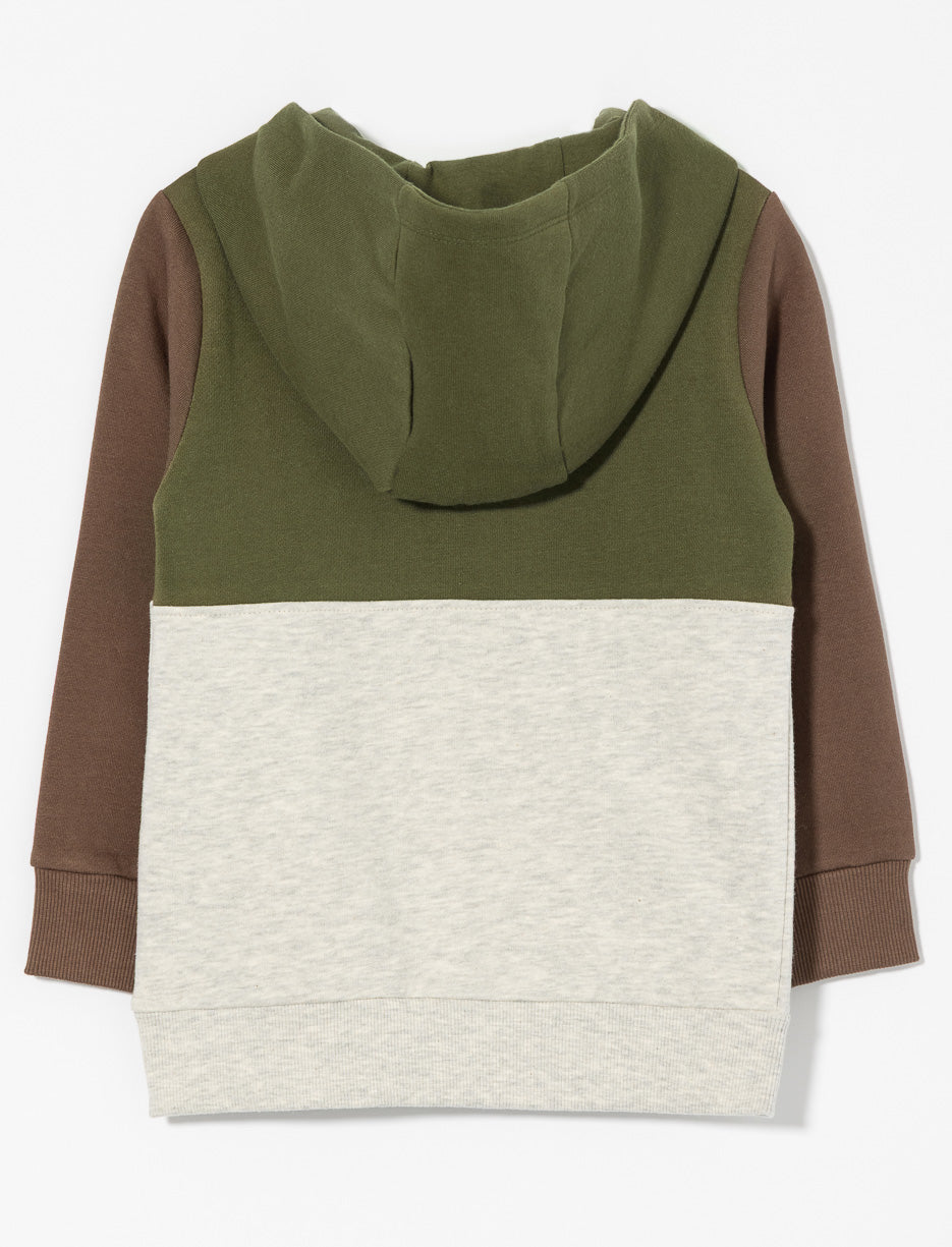 Chandail ouaté à capuchon pour petit garçon, avec poche à rabat et blocs contrastants. Broderie à la poitrine, fermeture zippée au cou et finitions côtelées aux extrémités.