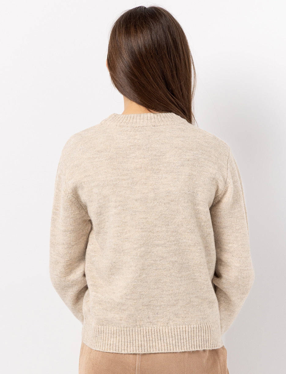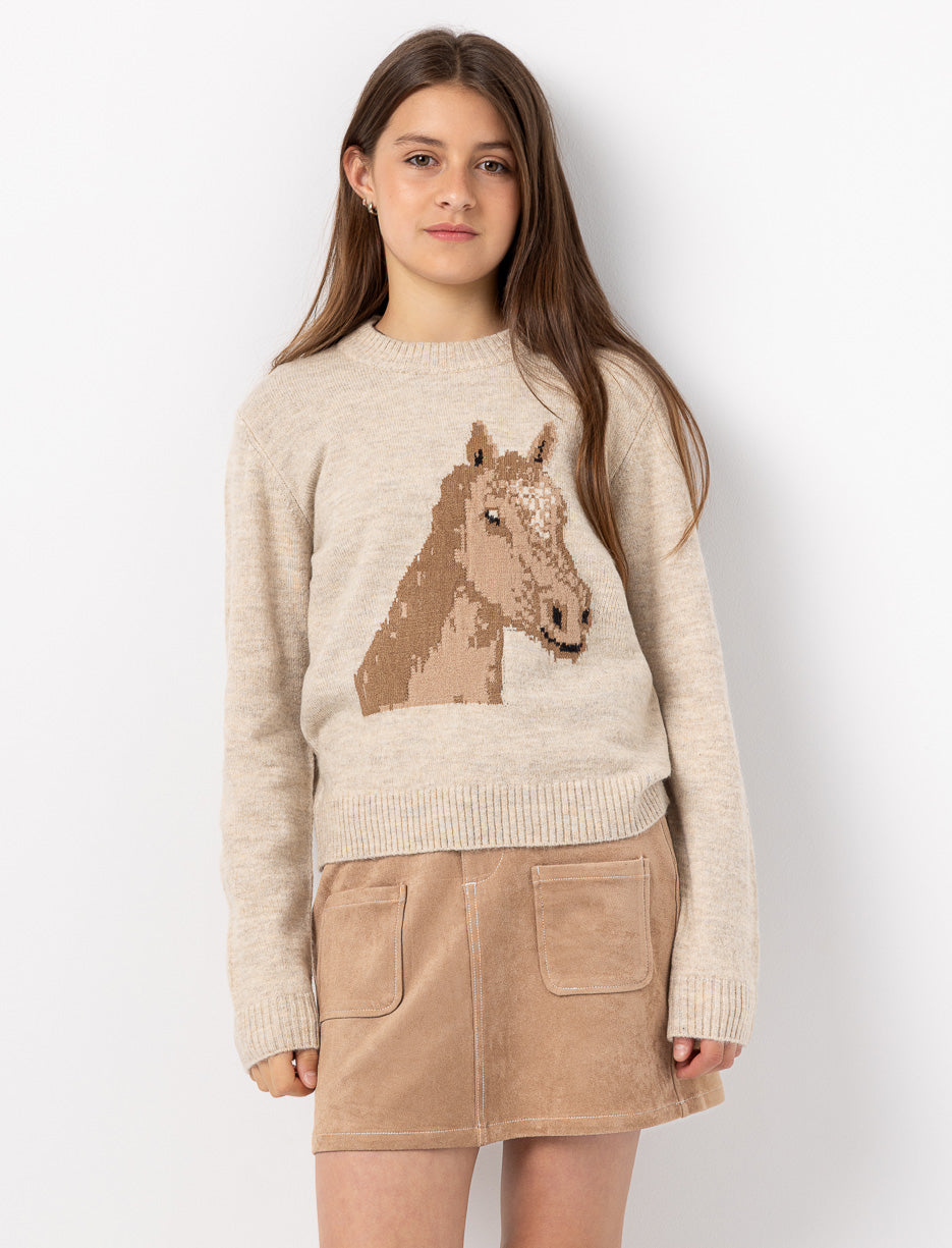 Ce chandail en tricot à motif cheval apporte une touche unique et chaleureuse, parfait pour composer un look automnal réussi.