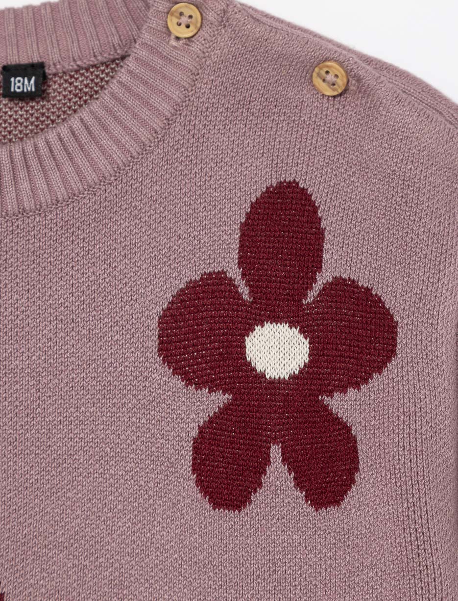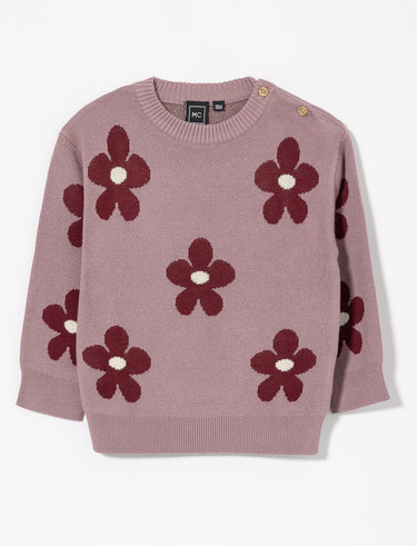 Un chandail en tricot doux à manches longues et épaules tombantes. Son col rond et ses fleurs délicates ajoutent une touche de charme aux journées fraîches.