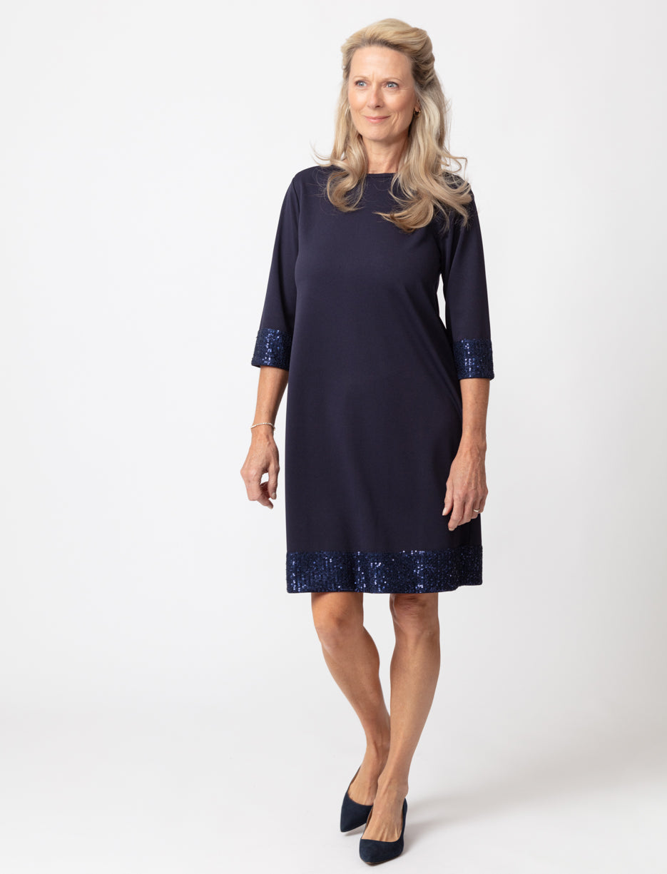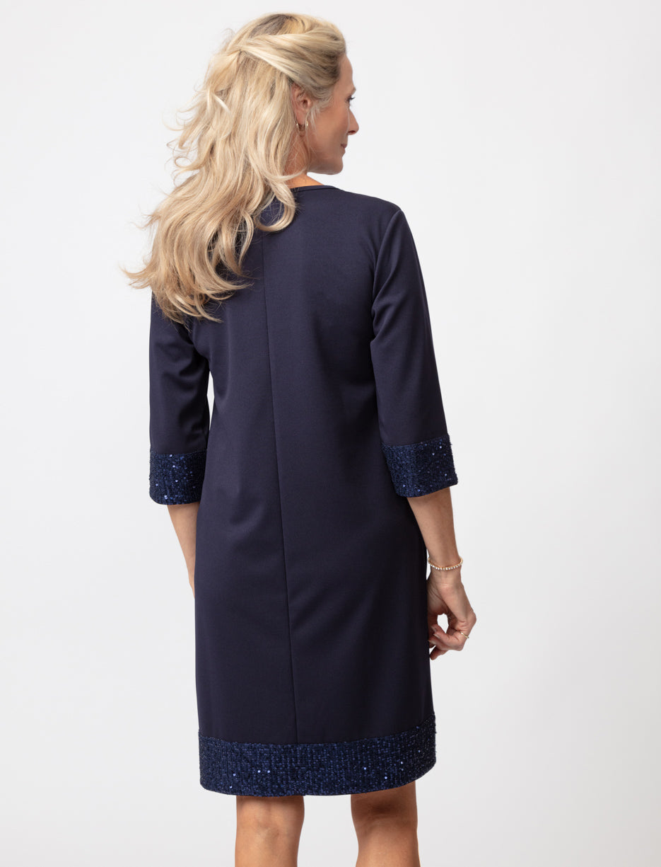 Cette robe élégante est parfaite pour toute occasion spéciale, avec ces détails de paillettes scintillantes sur les manches et l'ourlet qui rehaussent son charme sophistiqué.