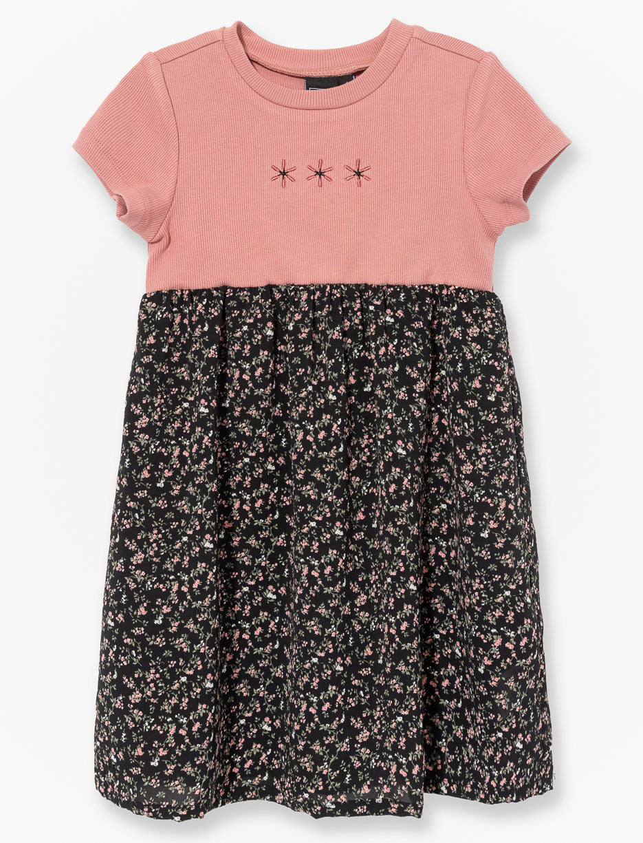 Cette adorable robe combine style et confort avec sa silhouette ajustée et évasée. Le haut uni orné d'une délicate broderie ajoute une touche d'élégance, tandis que le bas fleuri apporte une note joyeuse et printanière. Les manches courtes et le col rond assurent une liberté de mouvement totale.